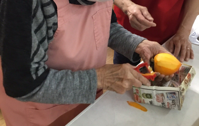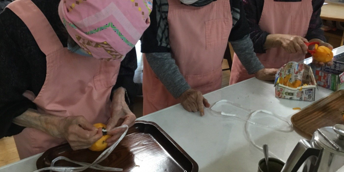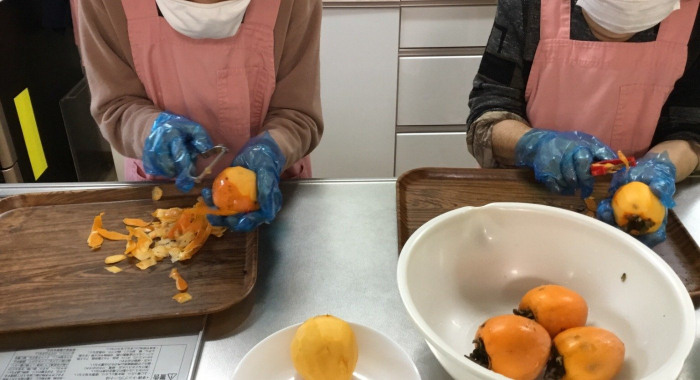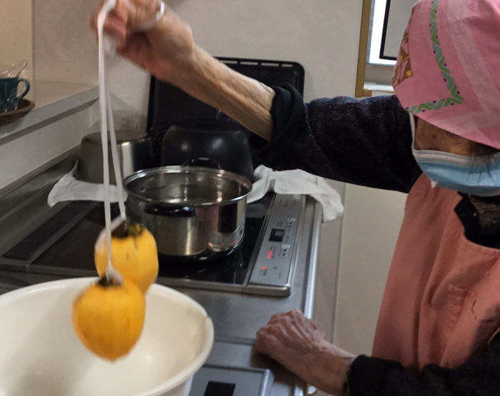 デイサービスなかの町 2021.12.21 干し柿作り 渋柿が手に入ったのでみんなで干し柿を作りました。 最初は「できん」「したことない」と消極的でしたが、いざ包丁やピーラーを前にするとさすが主婦。 職員も追いつかないスピードでクルクル上手に柿をむき、あっという間に完成です。 なかの町に来られた時に入口に吊るしてある柿を見てみなさん出来具合を確認されています☆