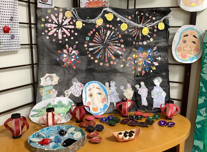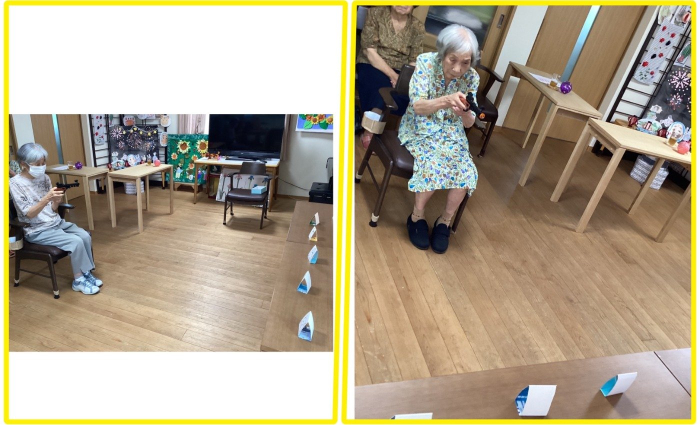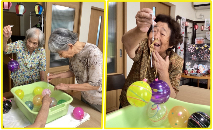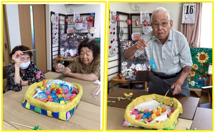 デイサービスなかの町 2022.08.18 夏祭り 8月16日~18日になかの町デイサービス夏祭りを開催しました。 入口には皆さんと時間を掛けて作ったお面や壁紙を飾り付け。 今年は手作りの金魚釣り、ヨーヨー釣り、射的を楽しんでいただきました。 「私はいいよ」と消極的だった方も、釣り竿や鉄砲を持てば一度で目つきが変わりこの真剣な表情です! お祭りと言えばやっぱりたこ焼き! 皆様、子供に戻った素敵な笑顔をいっぱい見せてくださいました!