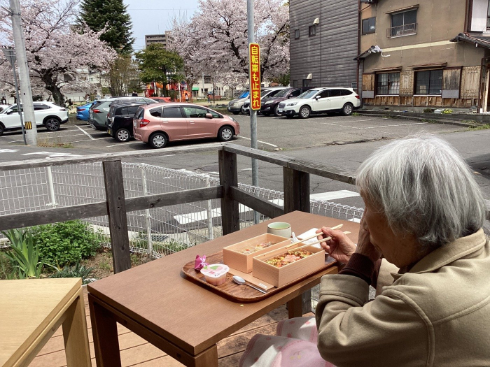 デイサービスなかの町 2024.05.13 お花見弁当 2024年 4月5日 毎年恒例のお花見弁当!! お天気にも恵まれ、敷地内にあるテラスにてお弁当を頂きました。 目線には近くの公園で桜が満開。自然と笑顔があふれ、ご利用者は 「綺麗やね」「またしたいね」と大喜びでした(^^)/ 桜の開花のスピードが一気に上がり、今日を逃してはと 午後から施設前にある公園にお散歩。 ようやく暖かくなり、桜を前に春を感じ、ご利用者に喜んで頂けることを 職員も喜んでいます。