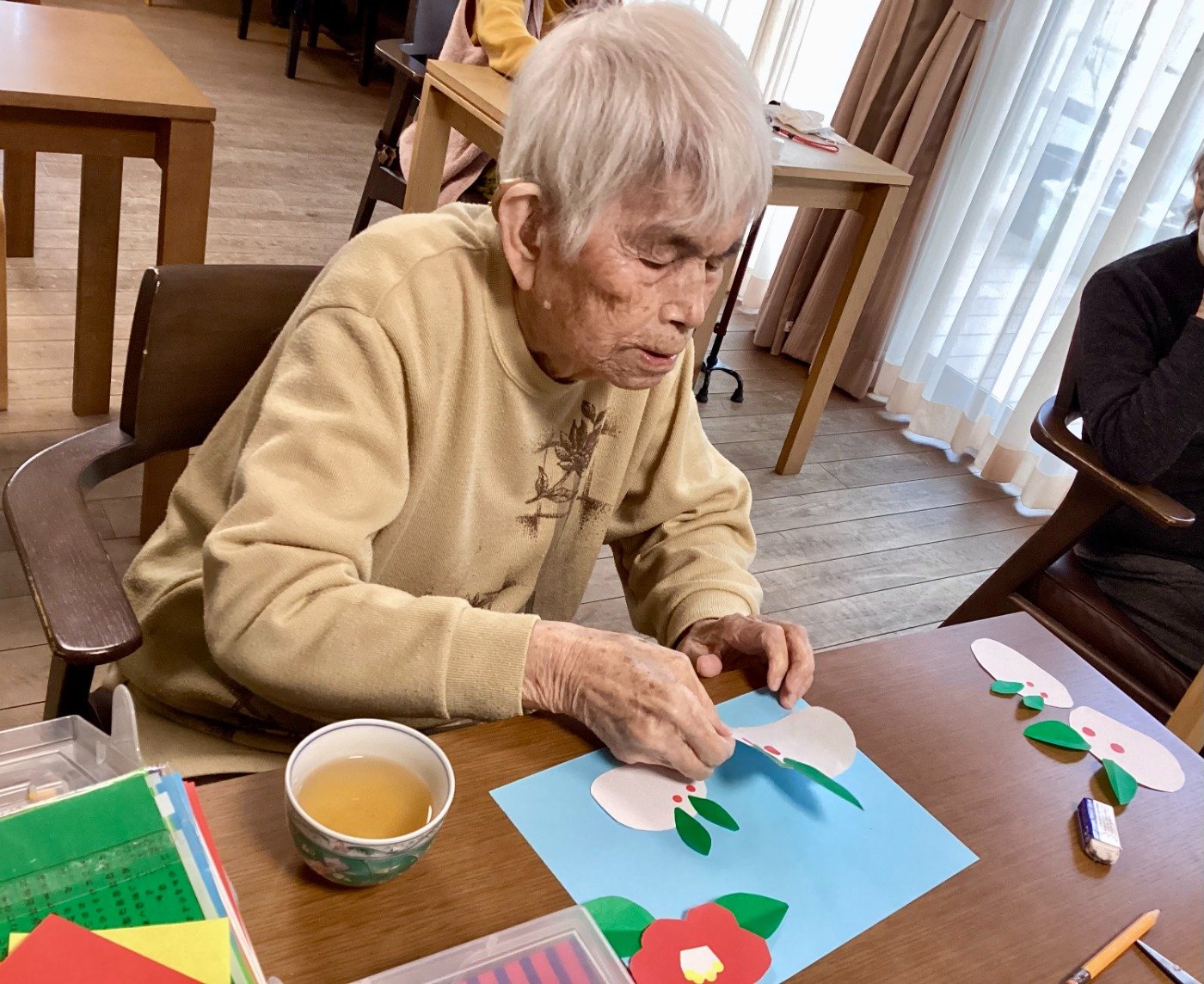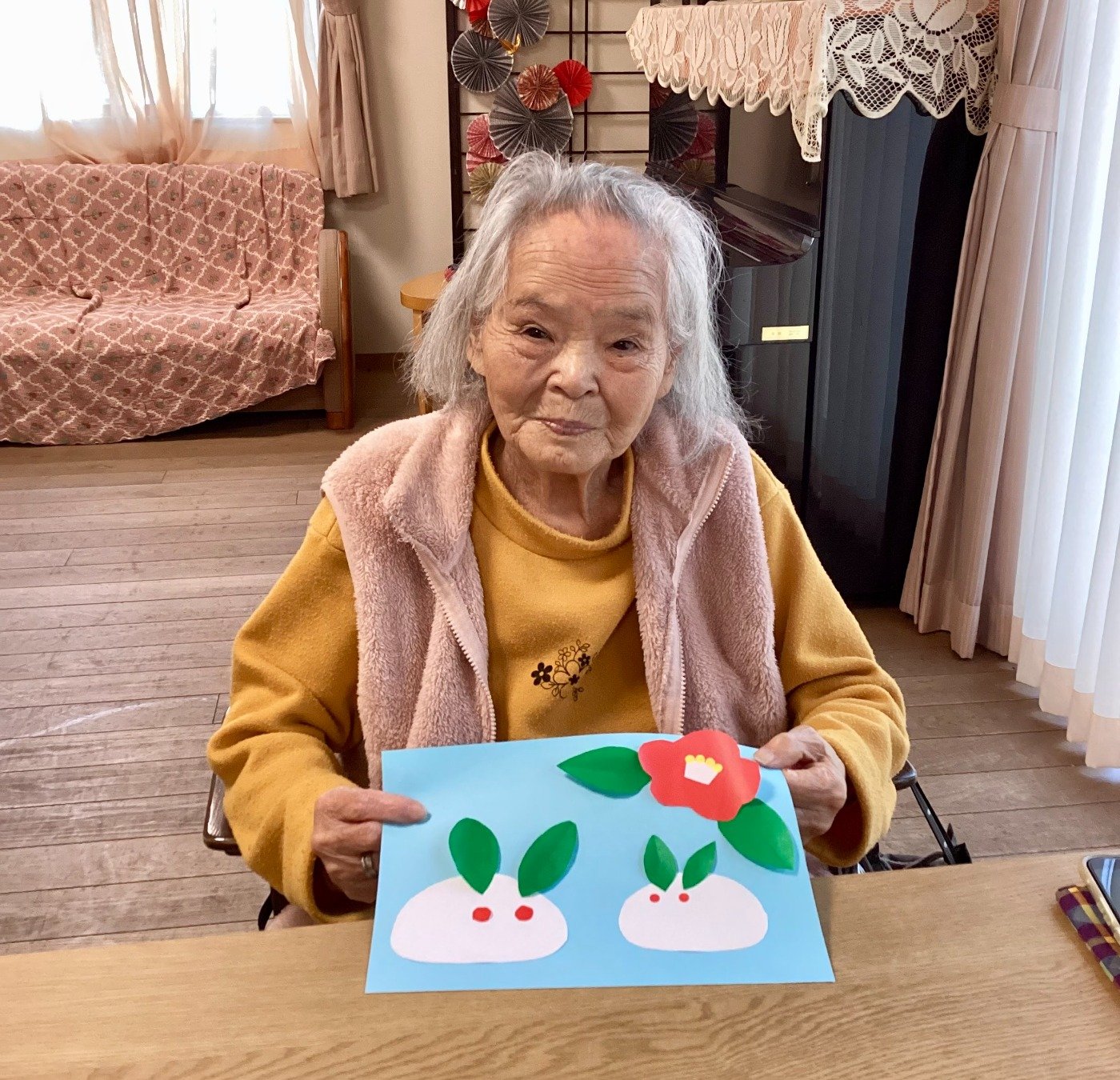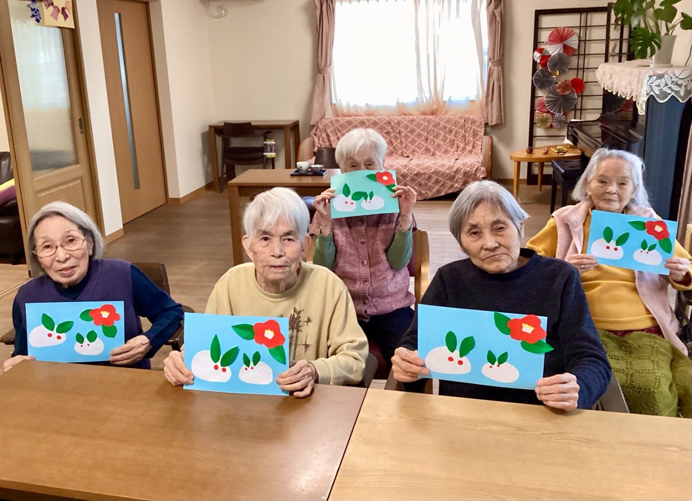 「葉っぱができたな」「あら、綺麗な椿になったわ!」「かわいいうさぎやね」