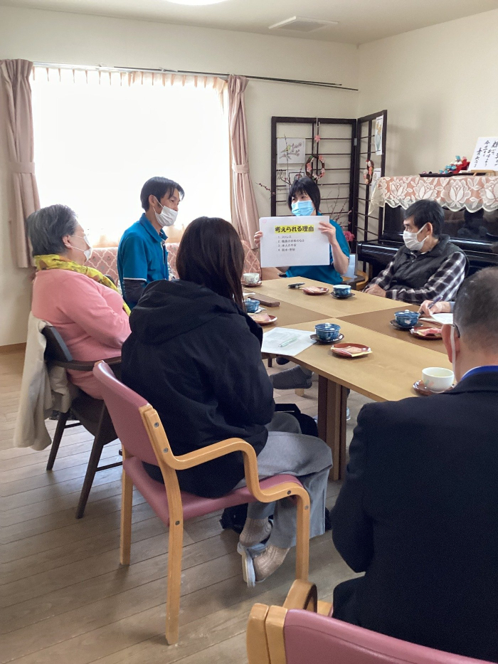 デイサービスなかの町 2026.04.11 運営推進会議開催!! 令和8年2月24日、ご利用者ご家族様、自治会長様、地域包括支援センター職員様をお招きして、運営推進会議を開催しました。認知症対応型のデイサービスを利用して、心身状態が改善した事例を紹介しました。また、日々自宅での対応で困っていることや工夫していることなど、皆さんで意見交換を行い、とても有意義な時間を過ごすことができました。