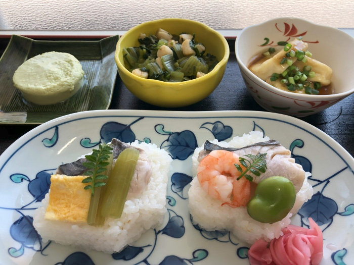さぬきの森 2024.05.10 五月の地産地消 【献 立】 ・鰆の押し寿司 ・赤だし汁 ・青菜のわさび和え ・揚げだし豆腐 ・お茶のムース 毎月第二金曜日の昼食は地産地消の日です。本日もたくさんの地場の食材をご用意出来ました。 お米(香川県産こしひかり)、さわら(香川県産)、筍(綾上町)、そら豆(綾上町)、卵(香川県産)、青菜(郷東町)、細ねぎ(上福岡町)、お茶のムース(高瀬町の茶葉使用)です。 「うわー!押し寿司やー!」と皆様喜んで召し上がってくださいました。