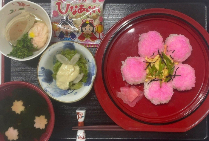 さぬきの森 2025.03.03 【 ひな寿司 】 3月3日 今日は「桃の節句」! 女性を災厄から守り、幸せを願うと言われています。 お寿司をお花のようにし、菜の花や葉ごぼうを使って可愛く春らしい食事にしました。