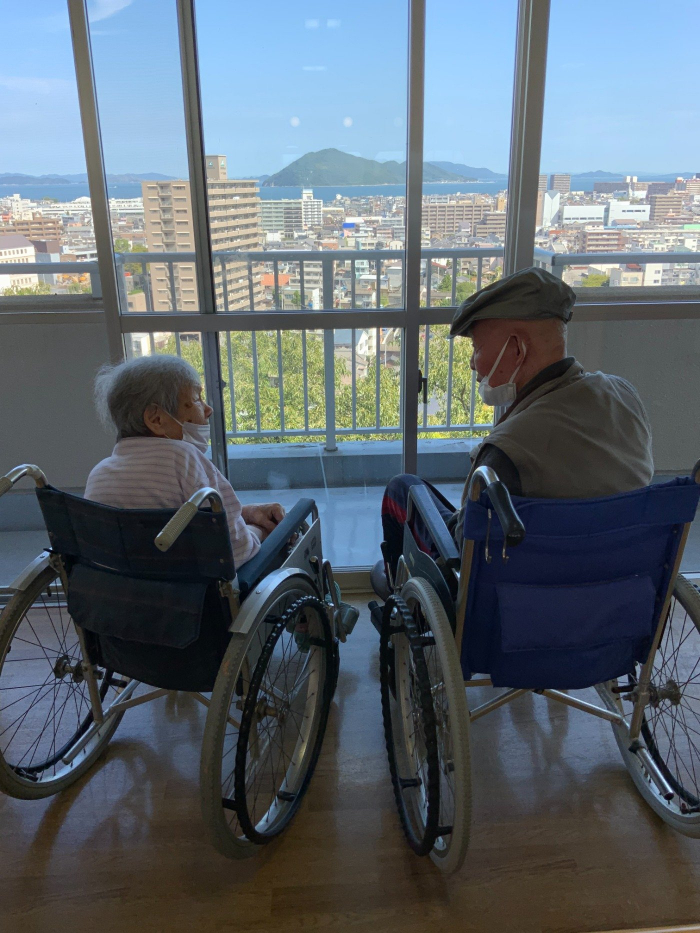 さぬき 2021.09.10 仲良し♡ お天気が良かったので、ケアハウス屋上までお散歩にいってきました! ケアハウスの屋上からは瀬戸内の島々が一望できます。 女木島出身のご利用者様が「桜が咲く頃になったら、皆でタコの煮たやつ食べに行こうなぁ」と嬉しそうに話してくださいました。