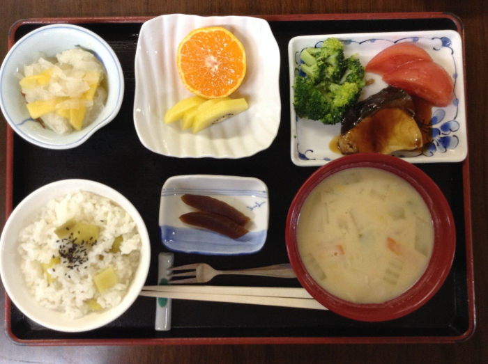 さぬき 2021.11.12 11月 地産地消 毎月、第2金曜日は地産地消の日です。 今日のメニューは【いも飯・オリーブハマチの照焼き・付)ブロッコリー・豆乳味噌汁・柿なます・果物(みかん)】です。 お米・オリーブハマチ・豚肉・ブロッコリー・さつまいも・金時人参・みかん・キウイが、香川県産の物が手に入りました。 皆さんに「美味しい」と言ってもらえました。