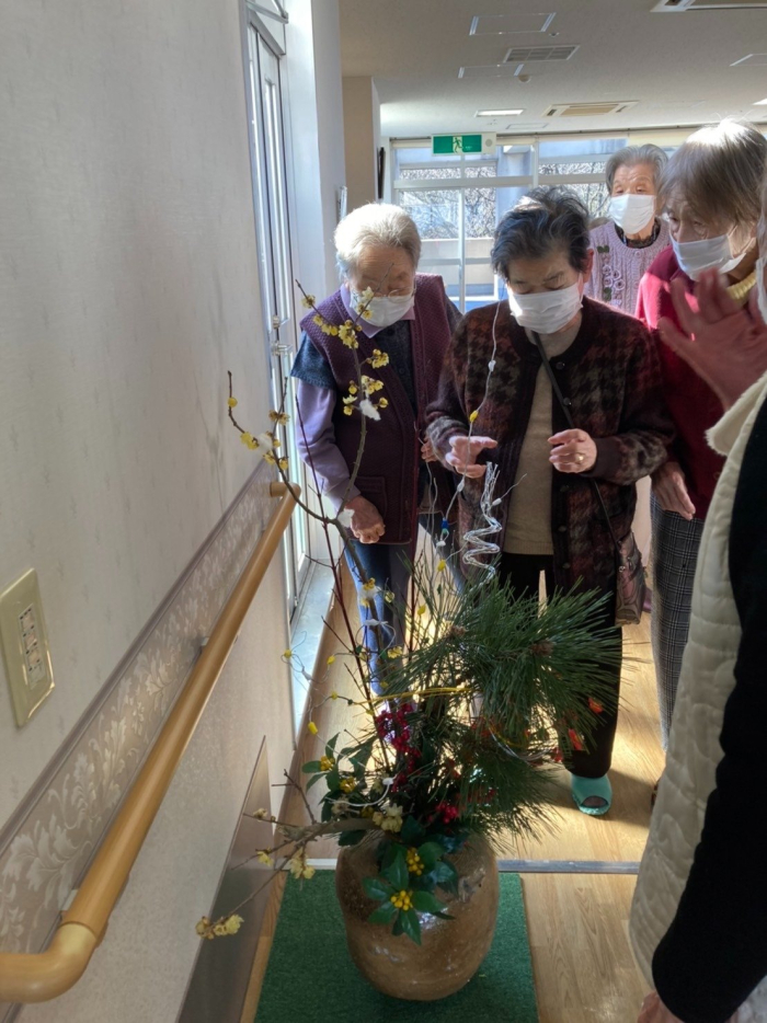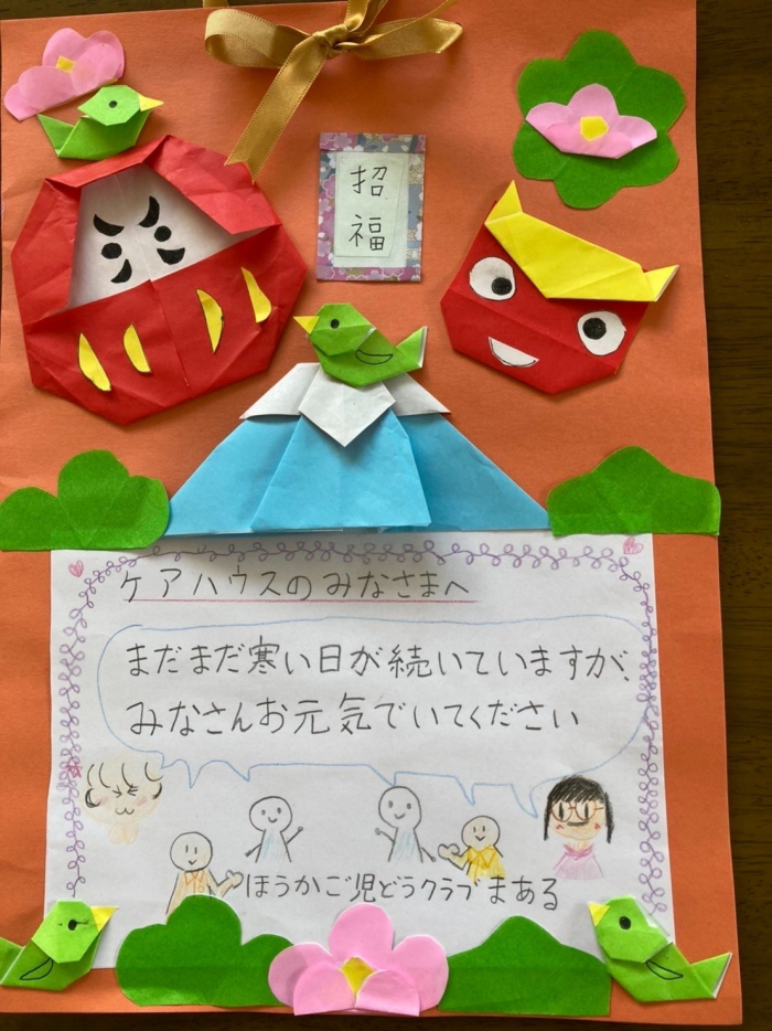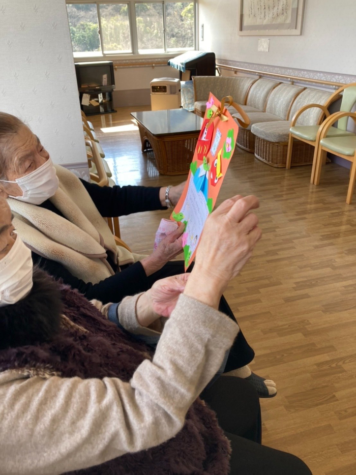 さぬき 2022.01.20 初釜茶会~暖かい交流~(#^.^#) 今日は、初釜茶会でしたが、内容は・・・ 放課後児童クラブまあるの子供たちから、嬉しい壁掛けが届きました。 入居者の皆様は、しっかりとした字体に感心され、「何年生かなぁ?」など、会話も弾み、暖かい気持ちになりました。 交流できる日が来ますように!