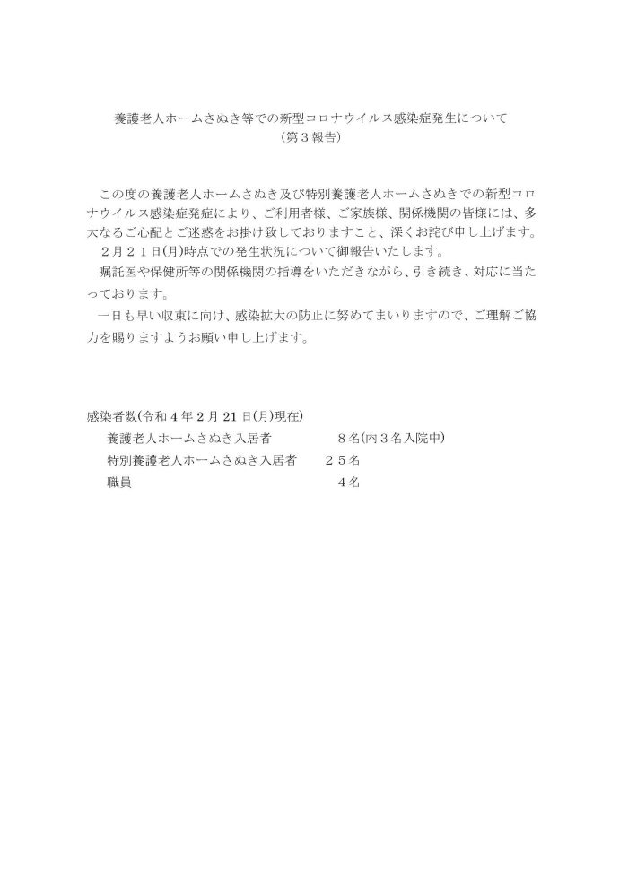 養護老人ホームさぬき等での新型コロナウイルス感染症発生について(第3報告)