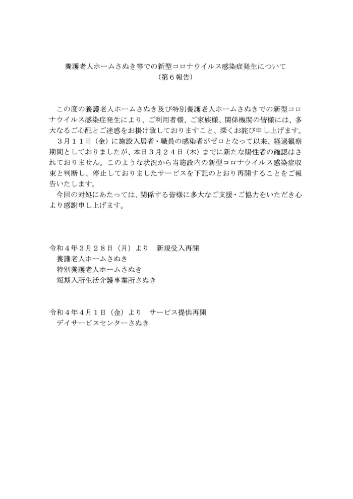 養護老人ホームさぬき等での新型コロナウイルス感染症発生について(第6報告)