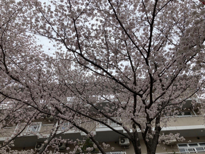薄曇りで、桜のピンクが映えています。