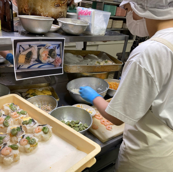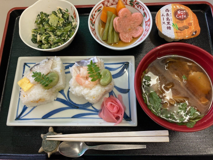 さぬき 2022.05.13 5月地産地消 鰆の押し寿司 5月の地産地消は4月20日に漁が解禁になった香川県産の鰆を使い押し寿司を作りました。 鰆の押し寿司は鰆の旬の4月5月限定のメニューとなっています。他にも精白米、そら豆、青菜、鶏ささみ、卵と香川県産の食材をたくさん使い作りました。利用者さんからは「おいしかった」の言葉をいただきました。