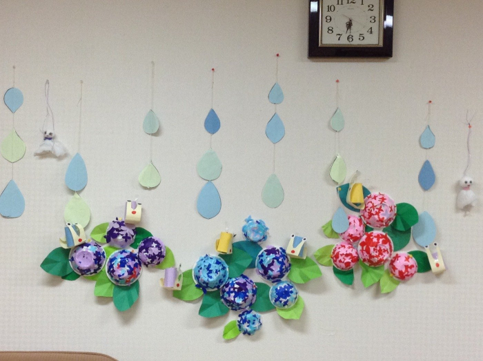 梅雨の時期が近づいてきました。雨の中、色彩り美しい紫陽花が咲きました。皆さまで力を合わせて一つの作品が完成しました。