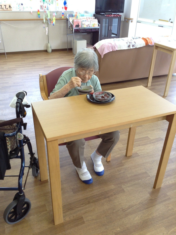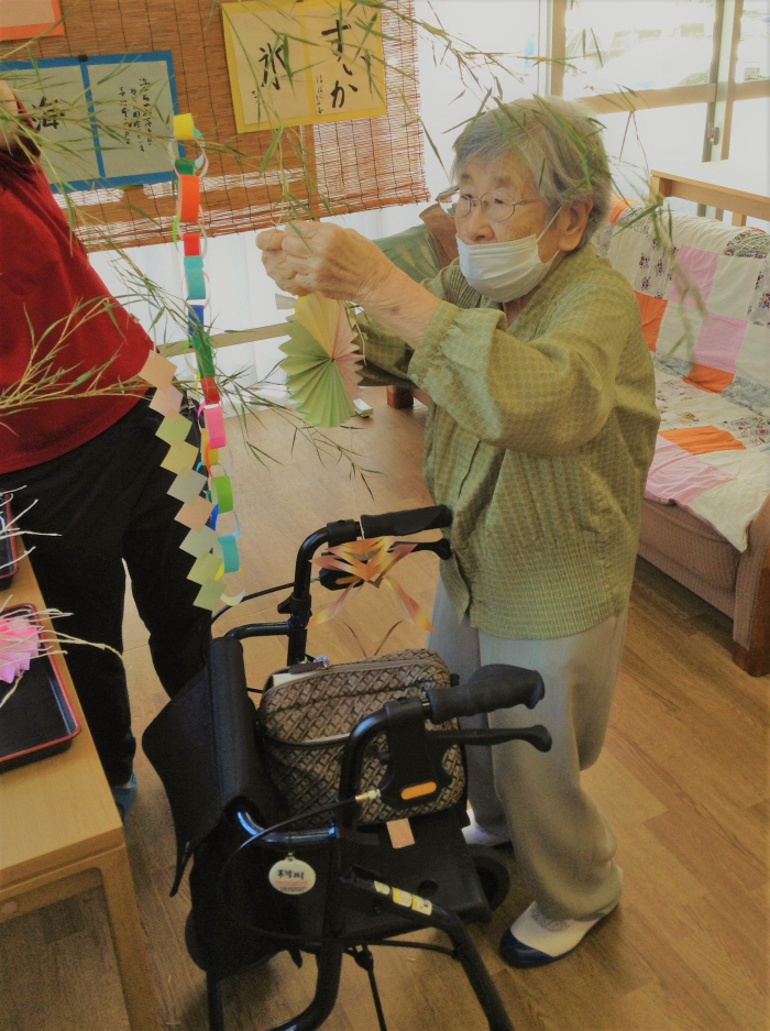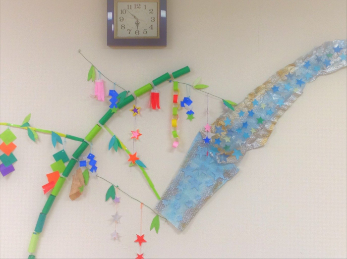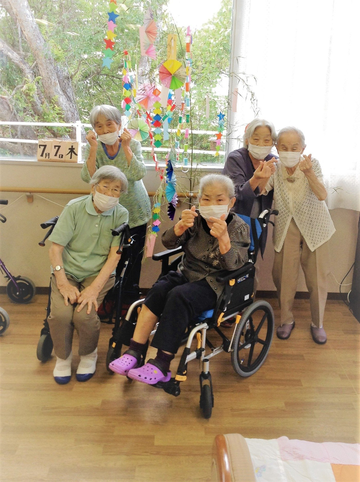 さぬき 2022.07.07 デイサービスセンターさぬき 七夕茶会 7月7日は七夕の日です。織姫さまと彦星さまが天の川を渡り、1年に1度巡り合える日。願いを込めてご利用者の方と一緒に壁画を作りました☆ 折り紙で七夕飾りをたくさん作りました♬ 色とりどりの短冊に願いを込めて色んな形の飾りを吊るす場所を決めながら楽しく飾りつけをしました。 お茶を美味しく点ててくださいました♡ 点てたお茶といっしょに涼やかな水ようかんを召し上がりました。 皆様で記念撮影をしました。満面の笑顔のショットです(^^♪)