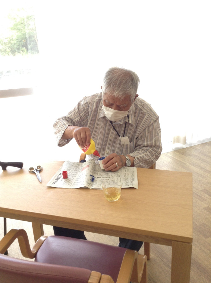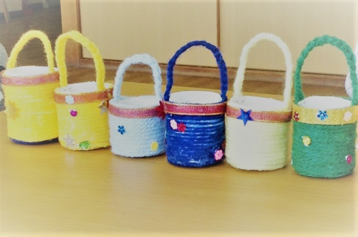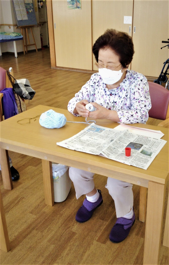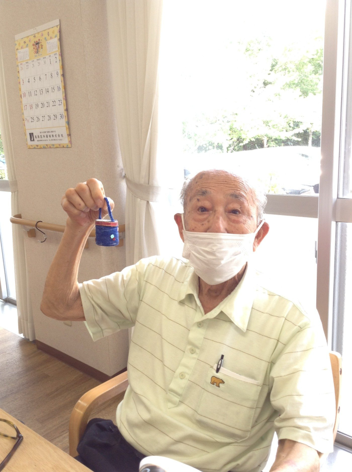 さぬき 2022.07.13 レクの時間に可愛い小物入れを皆様で作りました♪ 小物作りに挑戦しました☆ トイレットペーパーの芯を使い、利用者様に好きな色の毛糸を選んでいただきました。 毛糸を丁寧に巻き上げてビーズで飾りつけています。 ビーズを貼る作業に集中されています。☆彡 ブルーの毛糸で巻いて紐の部分も編み込んで作り上げました!! イメージや発想を活かしながら色とりどりの可愛い小物入れが完成しました。(^^♪)