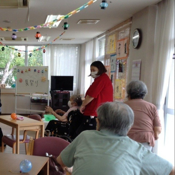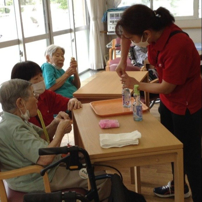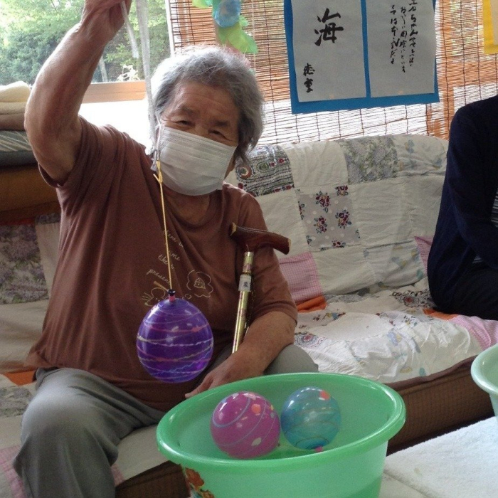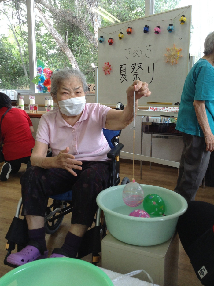 さぬき 2022.08.16 夏祭りを開催しました♪ 8月に入り利用者様と一緒に提灯を作りデイルームも飾りつけしました。夏祭り当日は射的や玉入れ、ヨーヨー釣りに挑戦!夏祭りの雰囲気を楽しまれて利用者様の笑顔がたくさんみられました。 射的は片眼をつむって的を狙い、皆様命中されていました。 祭りの最後は盆踊り(^^♪ 皆様で円になって職員も一緒に炭坑節を踊りました。 おやつの時間は懐かしい瓶ラムネで乾杯。ゼリーも食べながら昔のお祭りの話で盛り上がりました(^^♪ 利用者様からの「楽しかったよ。」と笑顔で聞くことができ、職員も嬉しい気持ちになりました。