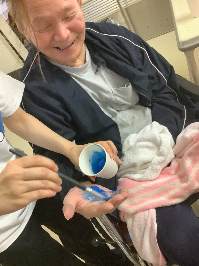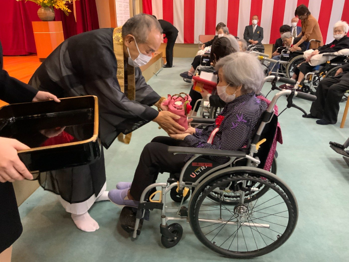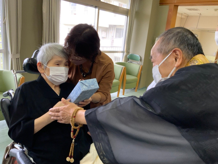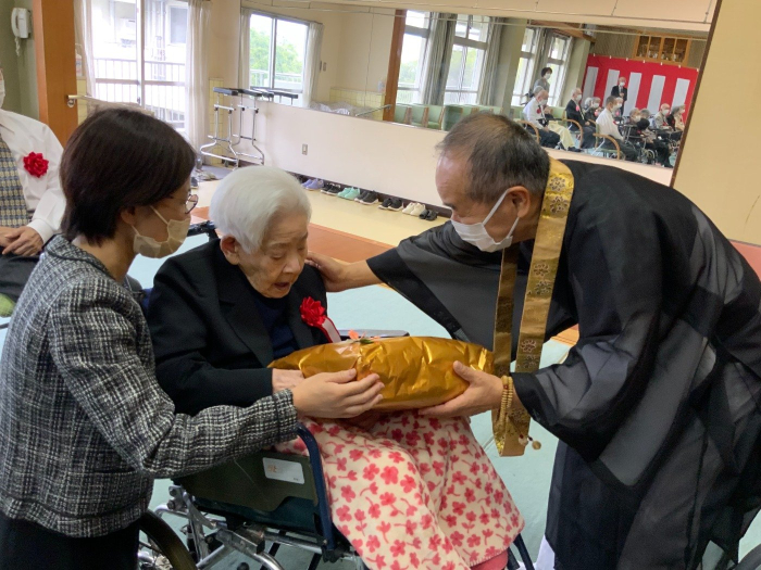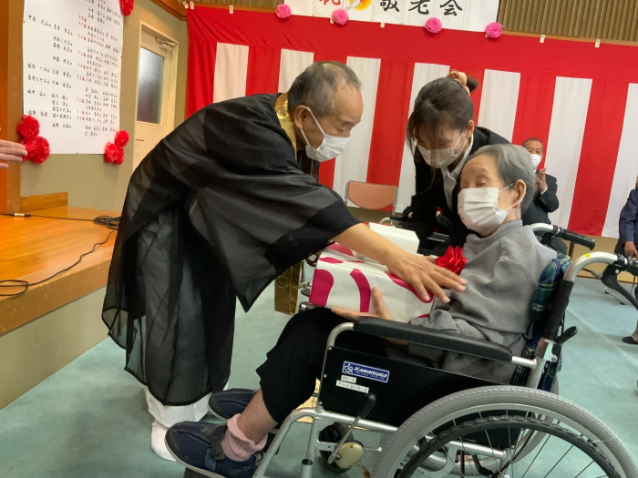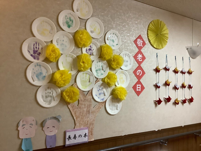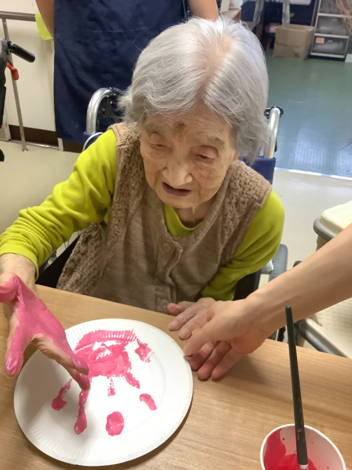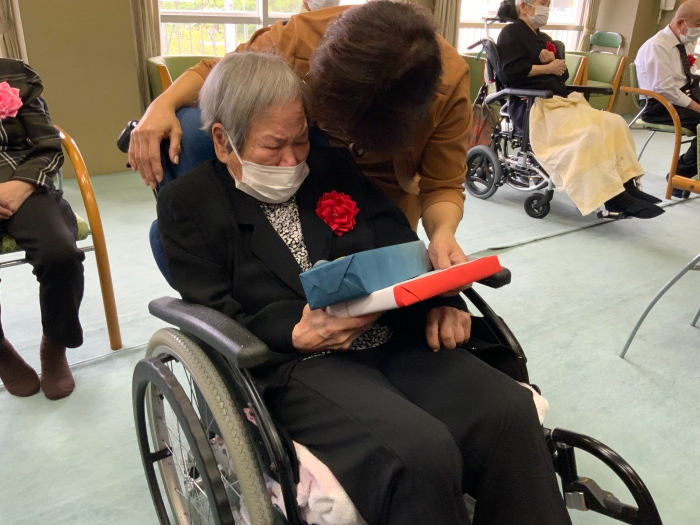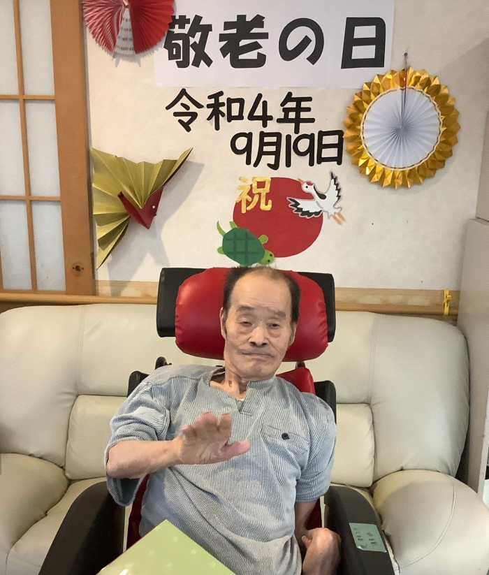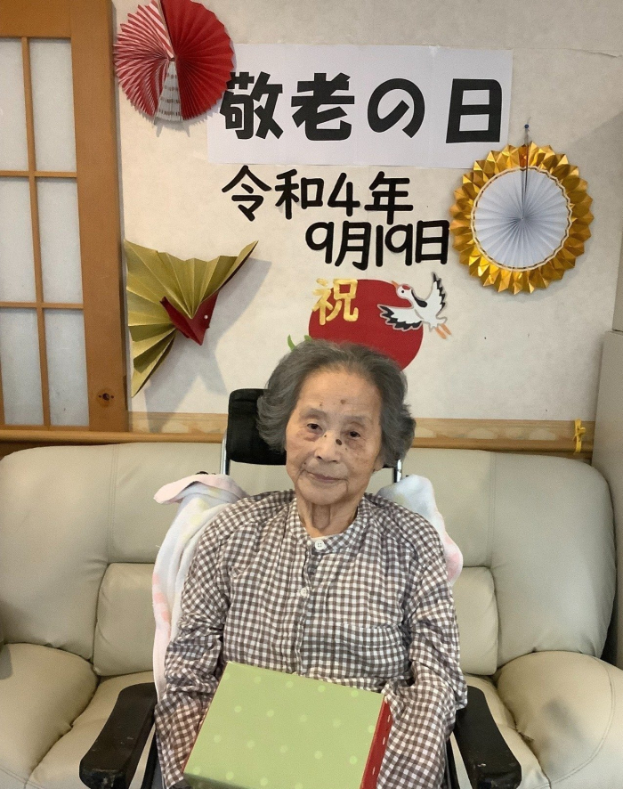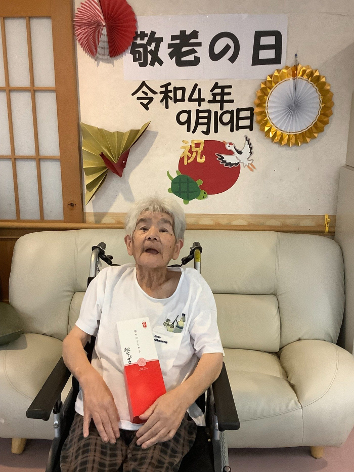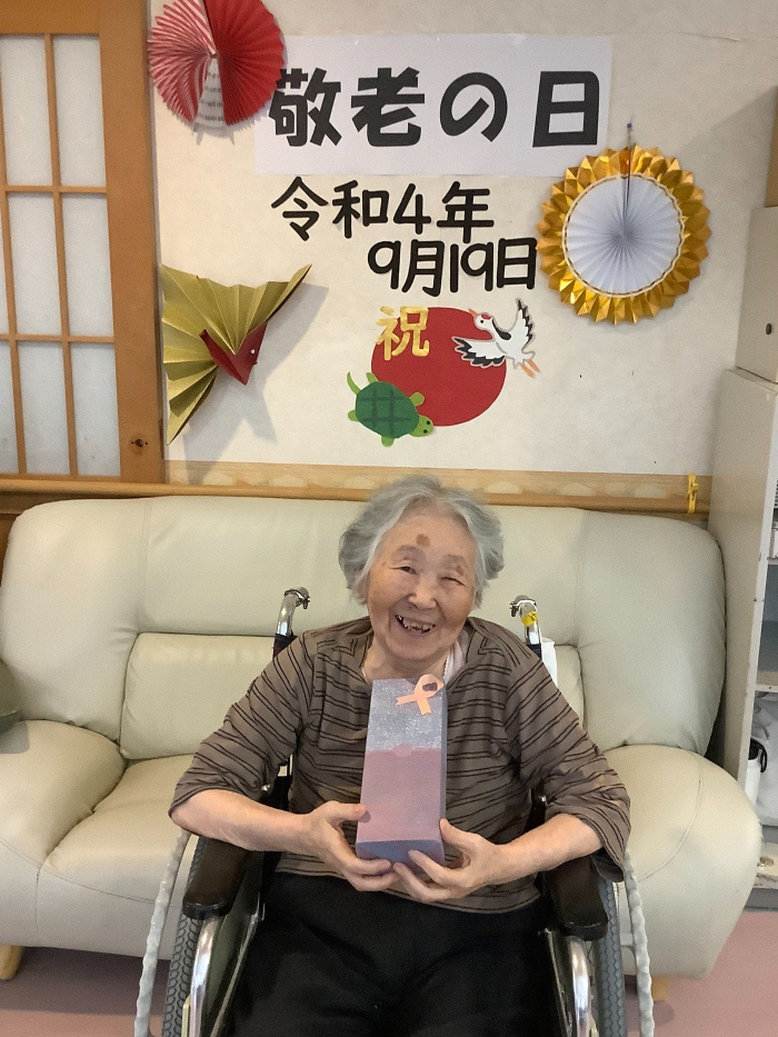 さぬき 2022.09.22 祝敬老の日! 9月19日月曜日、敬老式典が執り行われました。 さぬきの最高齢は102歳の女性です! 皆さんにお祝いの品をお届けしました。 おめでとうございます!! 「これくれるん?!まあ!!」 嬉しすぎて大号泣。「ありがとうでー!」 「えー!ありがとう!ほんまなあ!」「うれしい!」 皆さんの手形で長寿の木を作成!! 「ありがとうで。」 素敵な笑顔♡