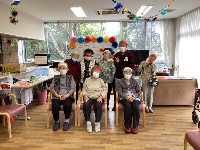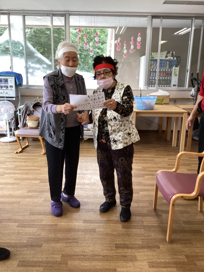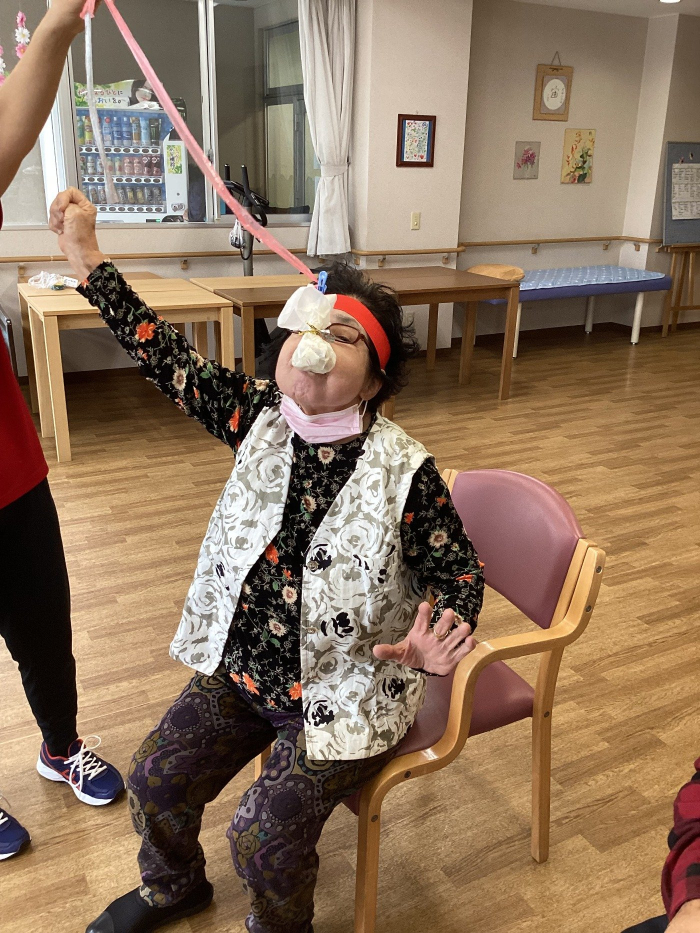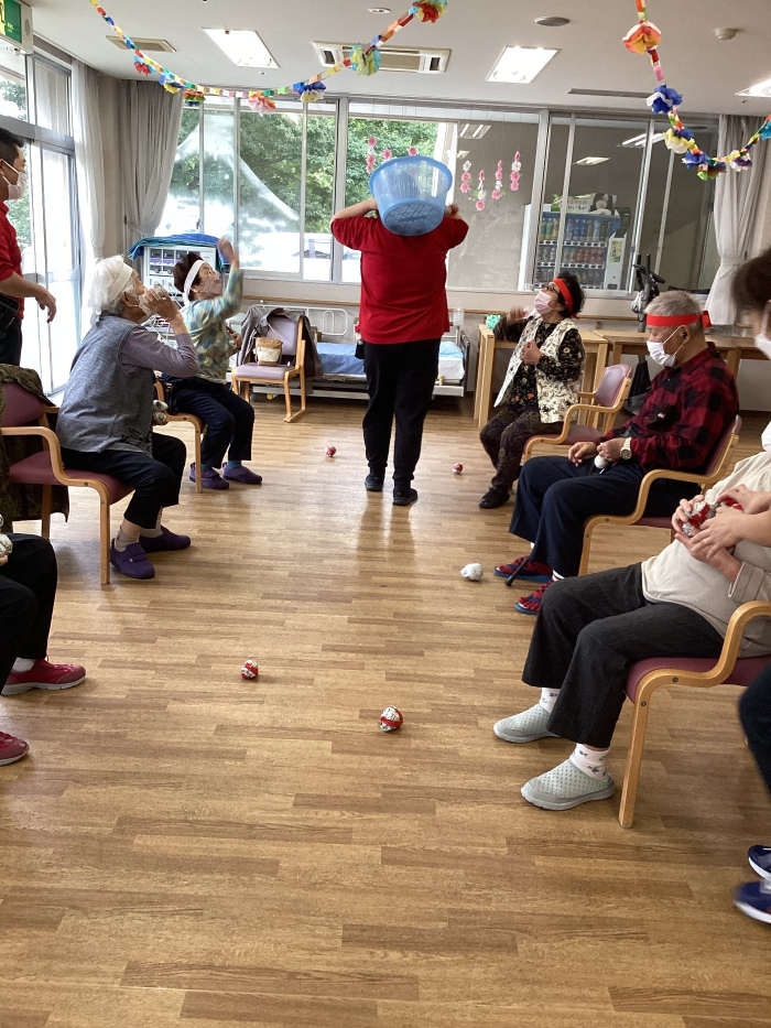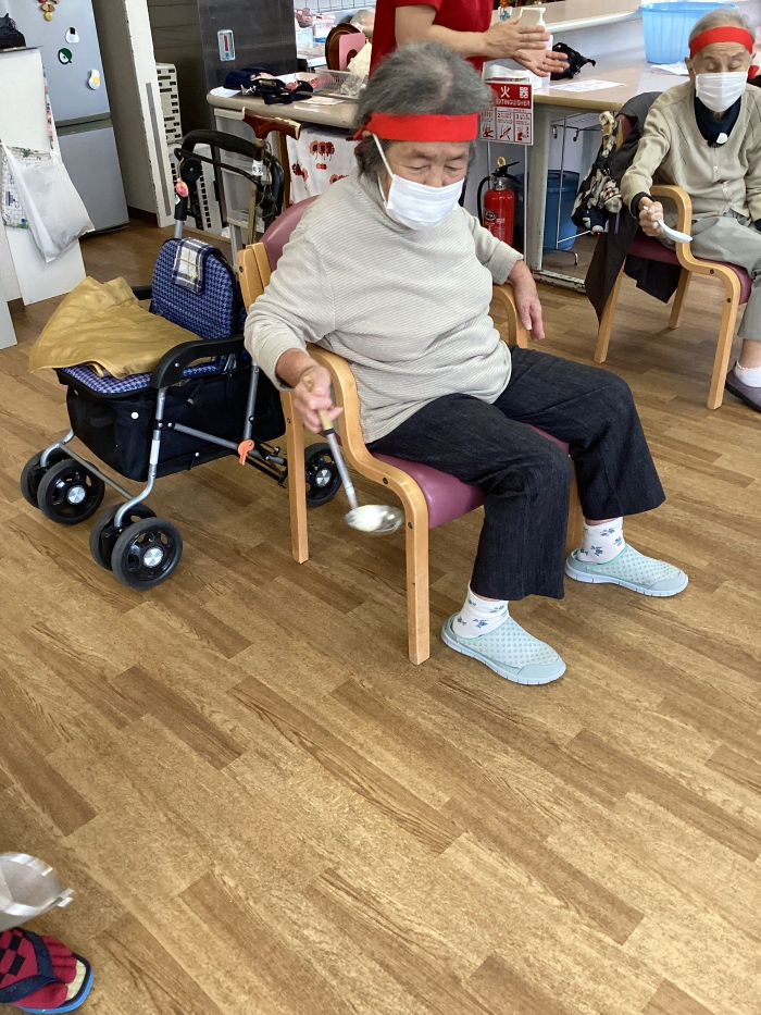 気候も過ごしやすくなり、スポーツの秋にちなんで秋の運動会を開催しました。種目は玉入れ、スプーンリレー、ロープ渡しリレー、お菓子食い競争です。チーム対抗戦ではちまきを巻いて各チーム代表者の方より選手宣誓をして頂きました。活気良く声を合わせて読んで下さっています。