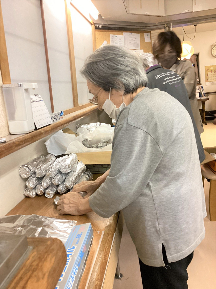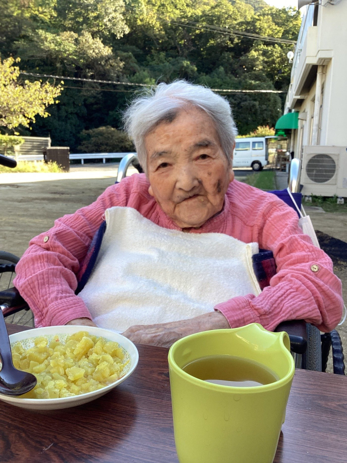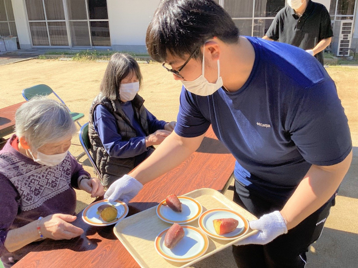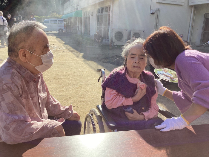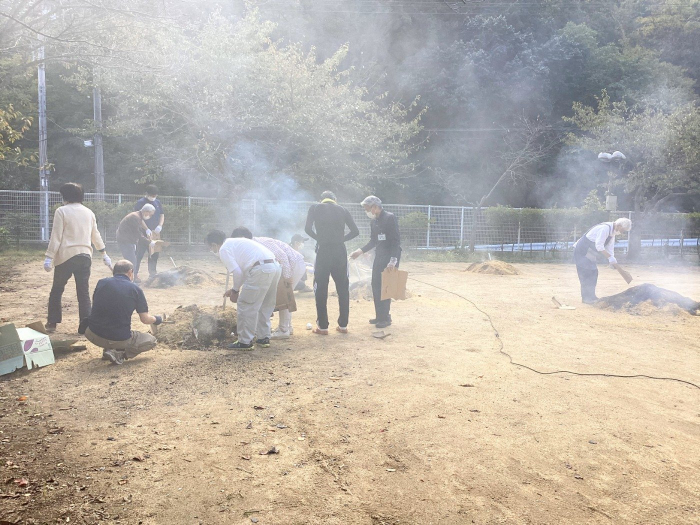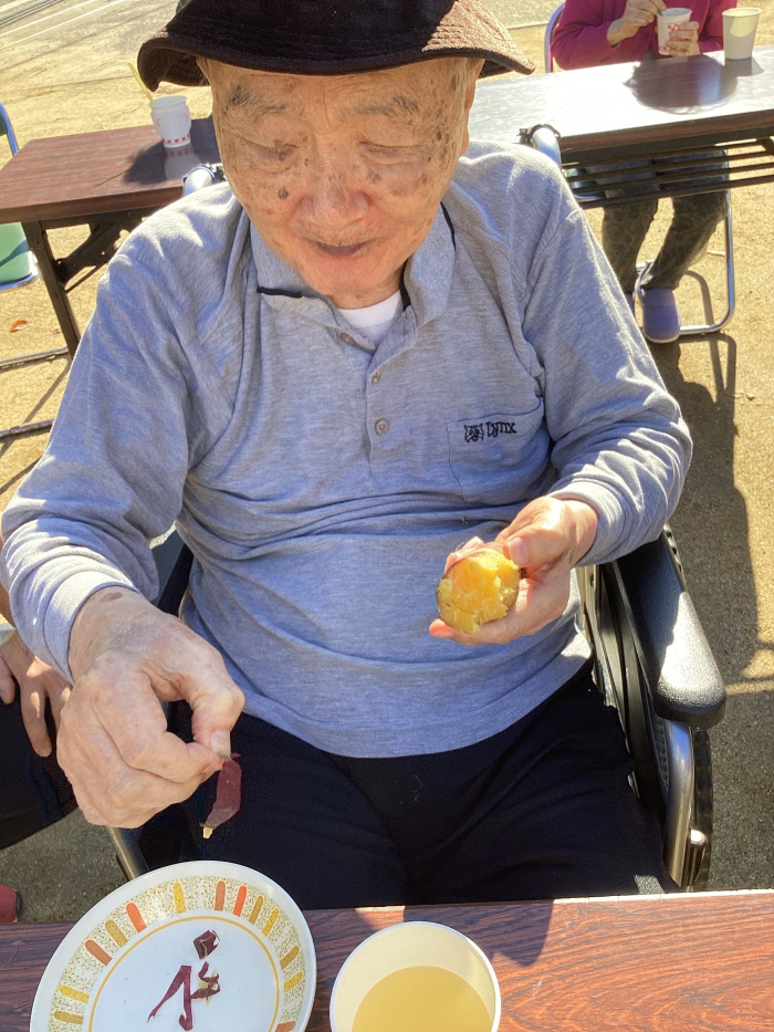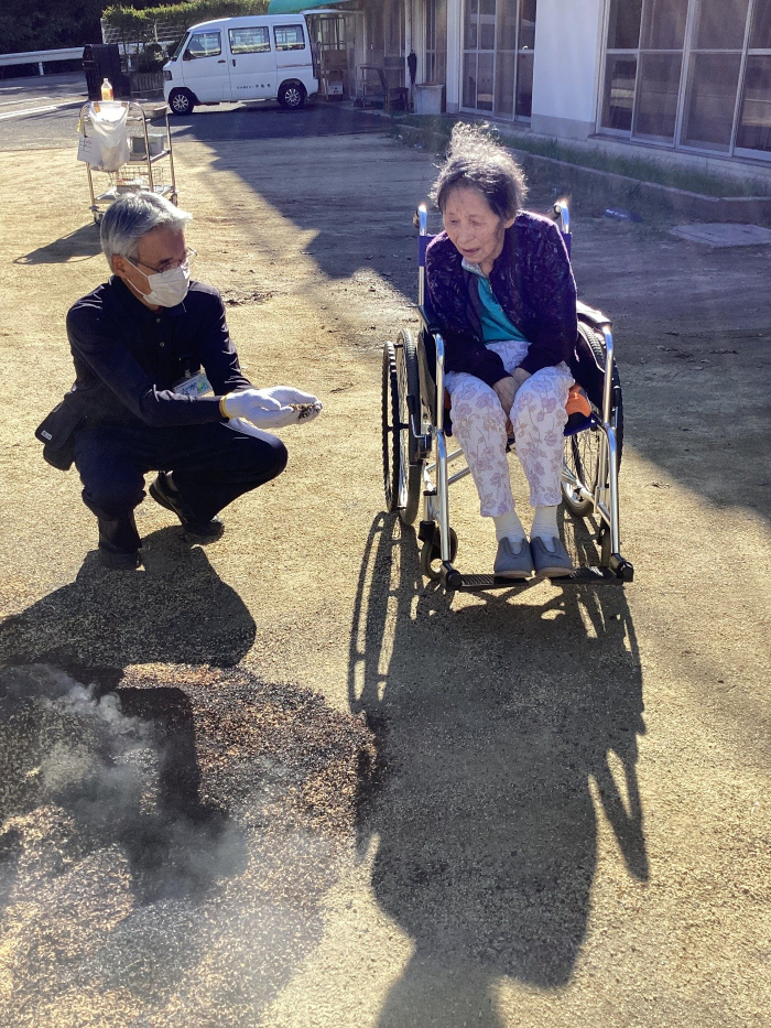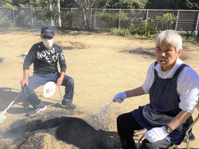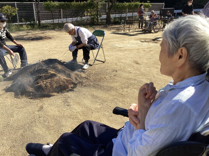 前日にご利用者に手伝っていただき焼き芋の準備でさつま芋を湿らせた新聞紙とアルミホイルでくるみ、当日朝からもみ殻に火をつけるのに四苦八苦しながらもなんとか着火できました。