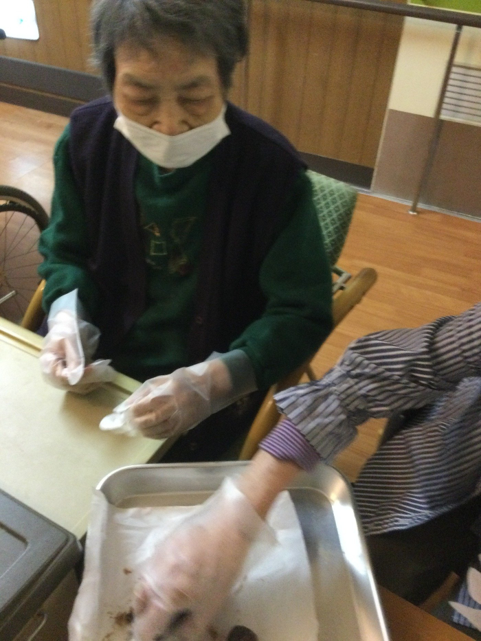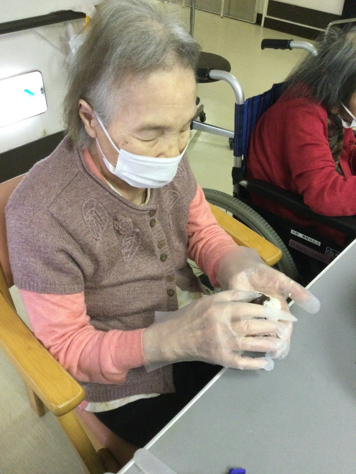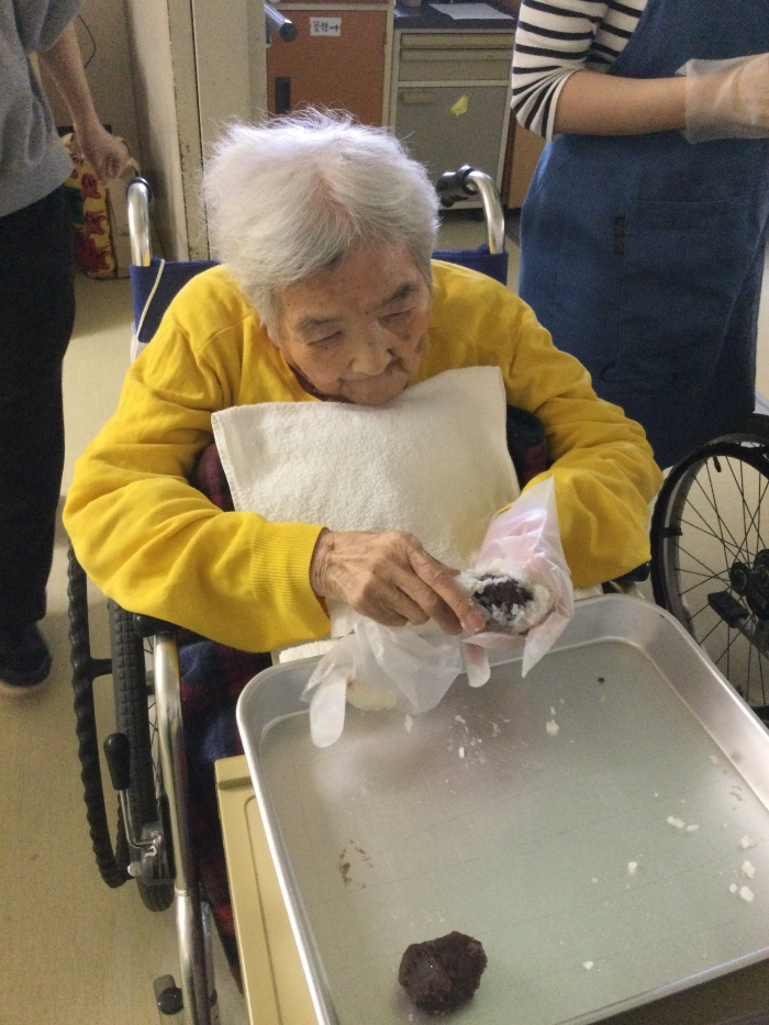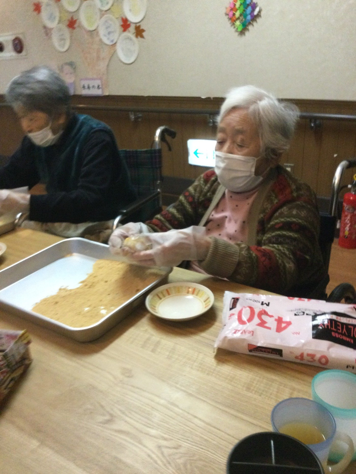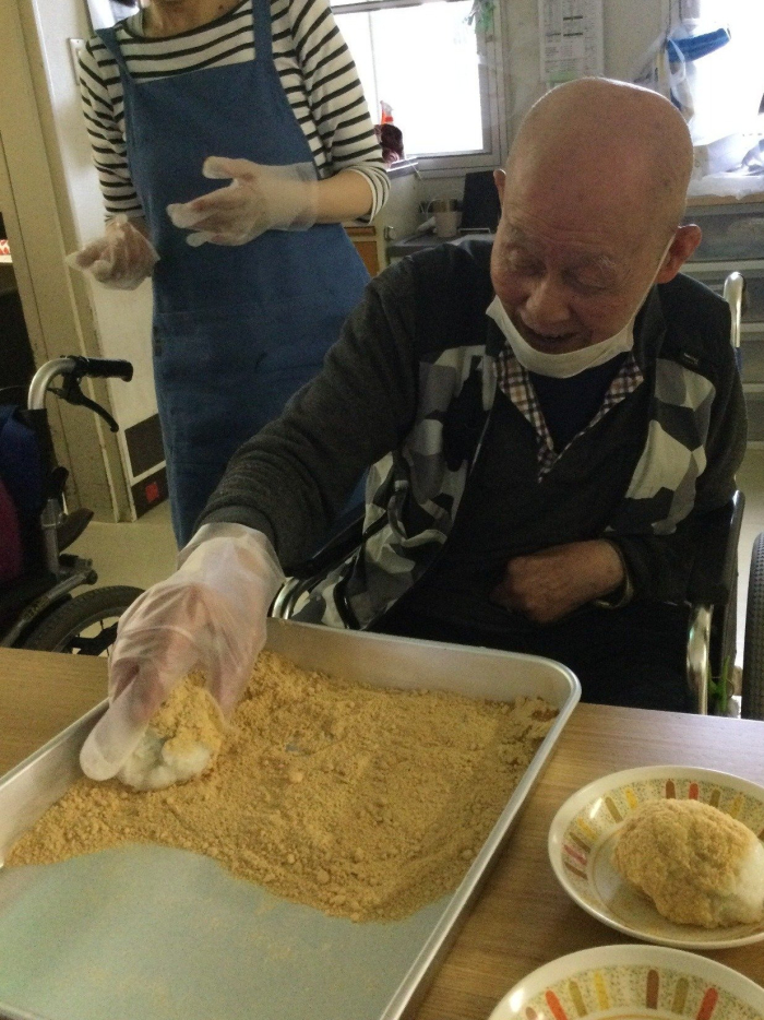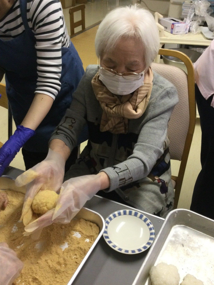 さぬき 2022.11.22 【特養】自分で作るおはぎが一番おいしい~♬ おはぎ作りをしたよ! 片方の手しか動かせない人も「なにか手伝うことがあるんだったらしようか?」と、きなこをまぶしてくれたり、自分できる事をみつけながら参加してくれました! 昔取った杵柄。慣れた手つきで丸めたり、あんこを包んだり。 できあがったおはぎは、大きさや形も個性でいっぱい! 自分で作るおはぎが一番!とてもいい表情で召し上がっていました(#^^#)
