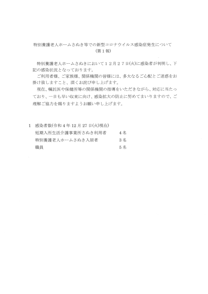 特別養護老人ホームさぬき等での新型コロナウイルス感染症発生について