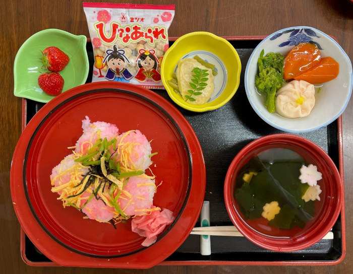 さぬき 2023.03.03 ひなまつり(桃の花の手まり寿司) ひなまつりのお食事は、春らしい桃色の手まり寿司です。他にもふきや菜の花、いちごなど旬の食材をたくさん取り入れて作りました。みなさんに喜んでいただけました。