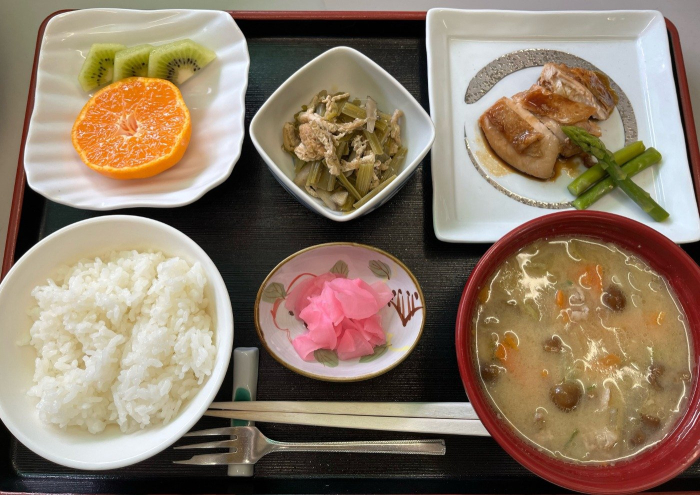 さぬき 2023.03.10 3月 地産地消の日 3月の地産地消の日のメニューは ・ご飯・鶏肉のわさび照り焼き・付)アスパラ・なめこ入り豚汁・葉ごぼうの炒め煮・果物(みかん)・さくら大根です。 香川県産食材は香川県産こしひかり、鶏肉(香川産)、アスパラ(綾川町)、大根(坂出市)、人参(坂出市)、白ねぎ(勅使町)、葉ごぼう(高松町)、みかん(鬼無町)、キウイ(善通寺市))です。 今月もたくさんの香川県産食材を使った料理ができました。