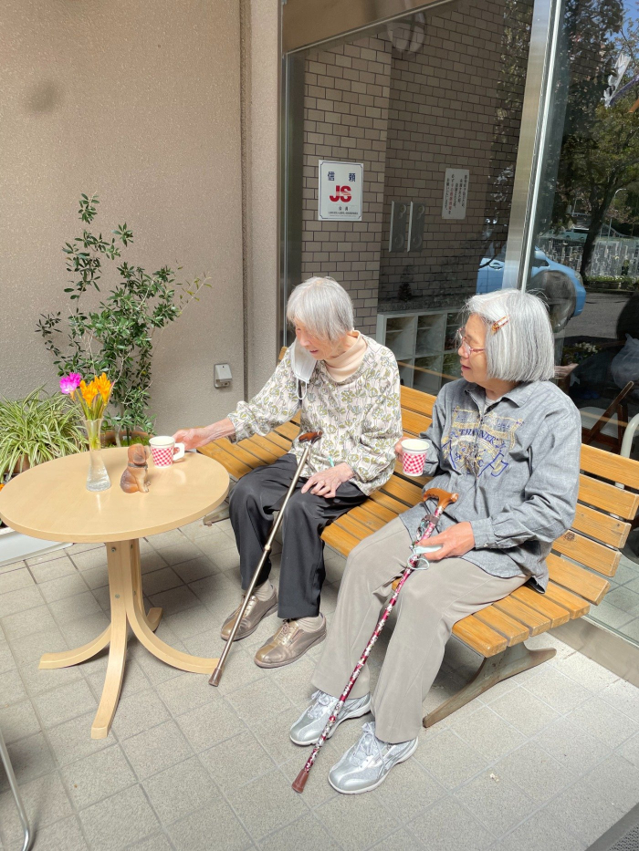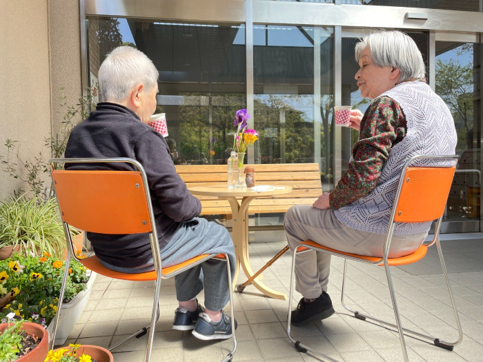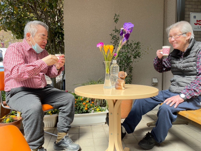 さぬき 2023.04.12 ティータイム たまにはお外でコーヒーを。 ほっと一息… 毎月、食堂でお茶会を開催していますが、本日は天気も晴れており、気温も丁度良かったので、久しぶりに外でコーヒーを飲んでもらいました。いつもと違う環境で会話が弾み、楽しそうに談笑されていました。
