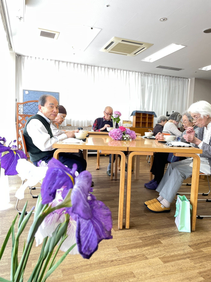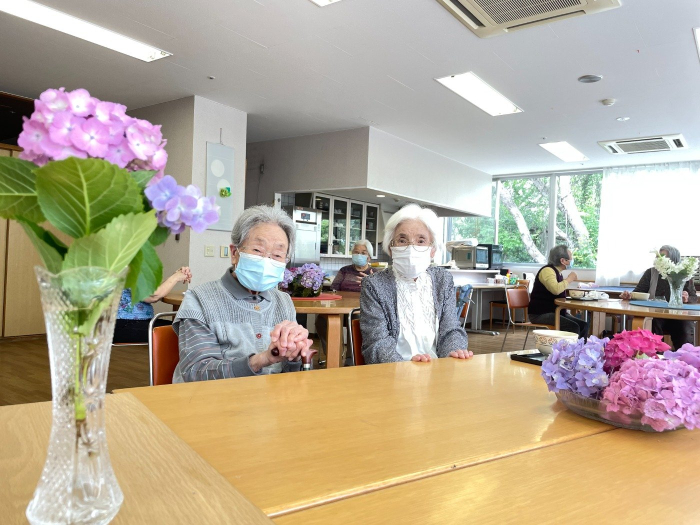 さぬき 2023.06.14 紫陽花茶会 紫陽花を見ながら「綺麗やなぁ。」と楽しそうにお話されていました。 こちらのご利用者様達も会話が弾みます。 本日はお茶会を開催しました。 施設園内に見頃を迎えた紫陽花が沢山咲いています。色とりどりの紫陽花を観ながらお茶を楽しんでいただきました。 お茶会後、「綺麗なお花が観れて良かったわぁ。」と喜んでいただけました。