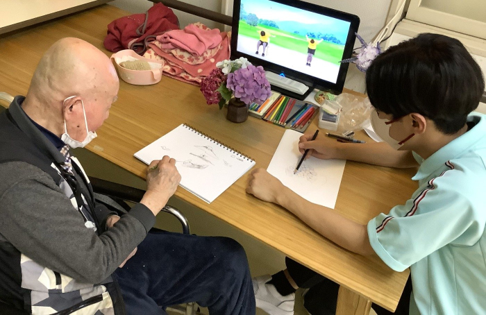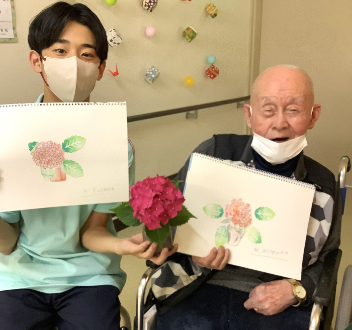 昔よく絵を描いていたという方とは玄関先まで一緒に紫陽花を摘みに行き、飾った紫陽花をモデルにお話しをしながらのびのびと絵を描かれおしゃれな仕上がりになりました。