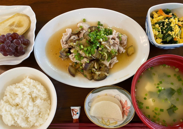 さぬき 2023.07.14 7月の地産地消 【献立】 ・ご飯 ・豚しゃぶの茄子香味だれ ・豆腐の白みそ汁 ・青菜と卵の和え物 ・果物(ぶどう・バナナ) ・漬物 今回の食材産地を紹介します。お米【こしひかり100%】・豚肉【香川産】・茄子【三木町】・太ねぎ【綾川町】・小松菜【郷東町】・細ねぎ【福岡町】・種なしぶどう【多度津町】です。