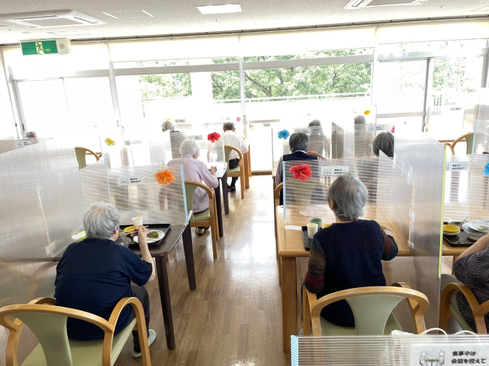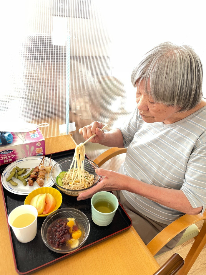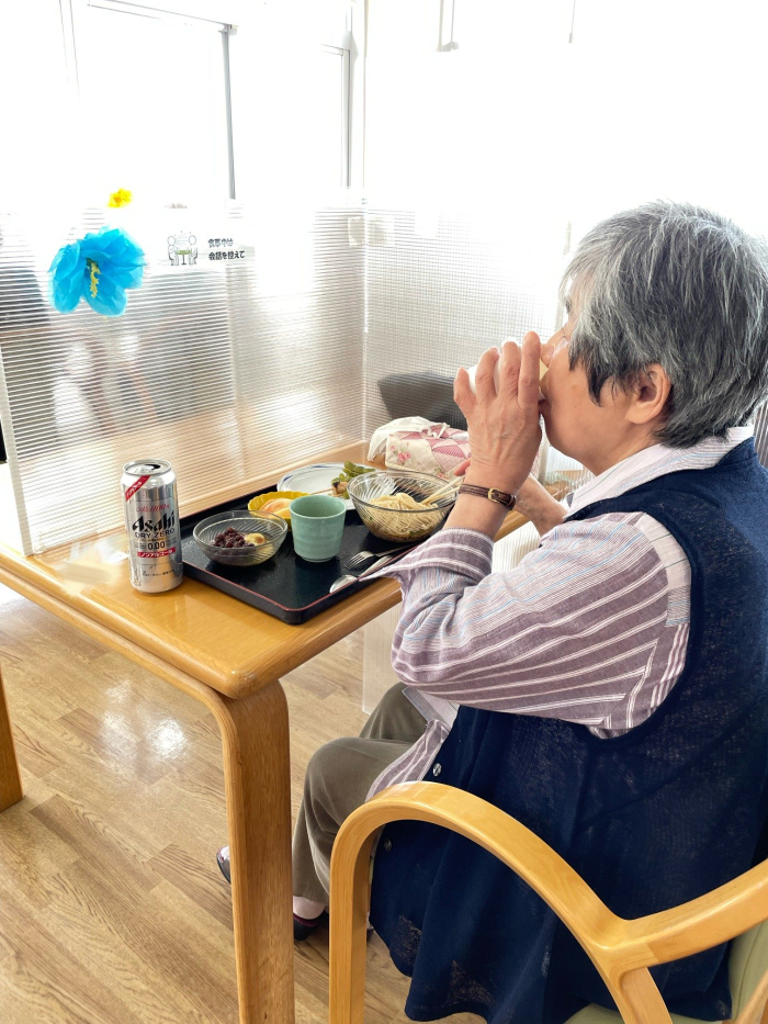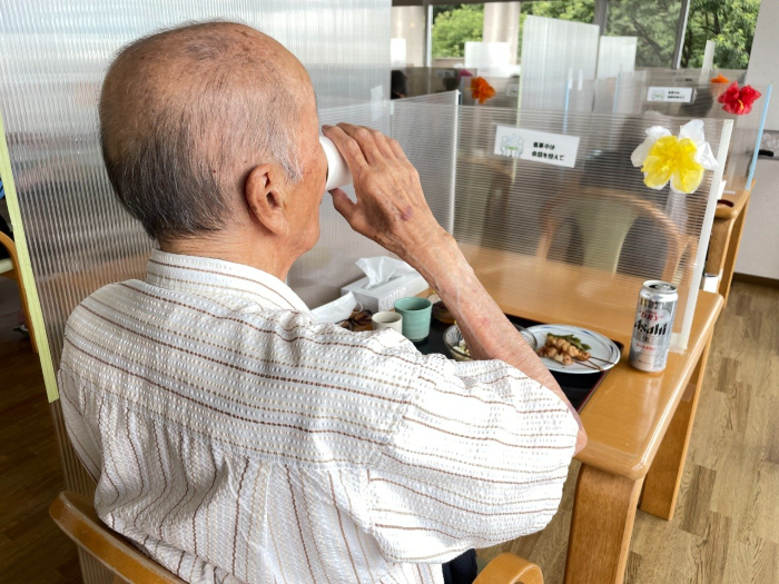 さぬき 2023.07.20 ビアホール ビアホール前からビールが飲めるのを、とても楽しみにされていました。 暑い日にはぴったりのお素麵やあん蜜を「美味しい。」と嬉しそうに食べられていました。 本日の昼食はビアホールということで、焼き鳥やビール、ジュースが提供されました!普段はお酒は飲まれない方も、ここぞとばかりに飲まれていました。 また、少しでも夏を感じてもらおうと手作りのハイビスカスを飾らせていただきました。 天候にも恵まれ、セミの声を聴きながら、夏のひと時を過ごされました。