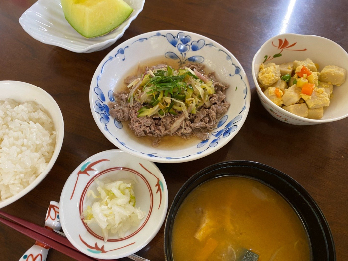 さぬき 2023.08.11 【 8月 地産地消 】 【 献立 】 ・ご飯 ・牛しゃぶのあっさりがけ ・味噌汁(かぼちゃ) ・高野の卵とじ ・果物(メロン) ・漬物 《産地紹介》精白米(こしひかり100%)・牛肉(香川県産)・きゅうり(香南町)・かぼちゃ(香南町)・太ねぎ(綾川町)・もやし(三木町)・メロン(三豊市)です。 牛しゃぶのあっさりがけは、酢を使い、暑い日にさっぱりと食べやすい料理にしてみました。