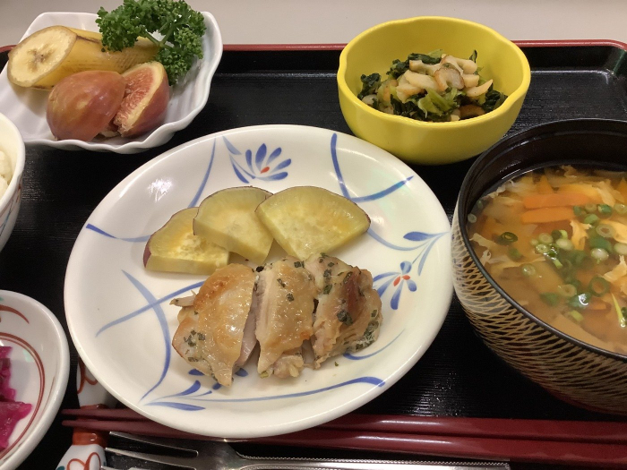さぬき 2023.09.08 9月の地産地消 【献 立】 ・ご飯 ・鶏肉のしそ焼き 付)さつま芋 ・かき玉汁 ・青菜の和え物 ・果物(いちじく・バナナ) ・しば漬け 毎月第2金曜日は『地産地消の日』です。今回は、ご飯(香川県産こしひかり)、鶏もも肉(香川県産)、さつま芋(坂出市)、卵(綾川町)、椎茸(塩江町)、細ねぎ(上福岡町)、いちじく(鬼無町)と、たくさんの食材をご用意出来ました。