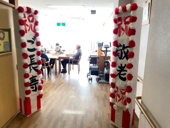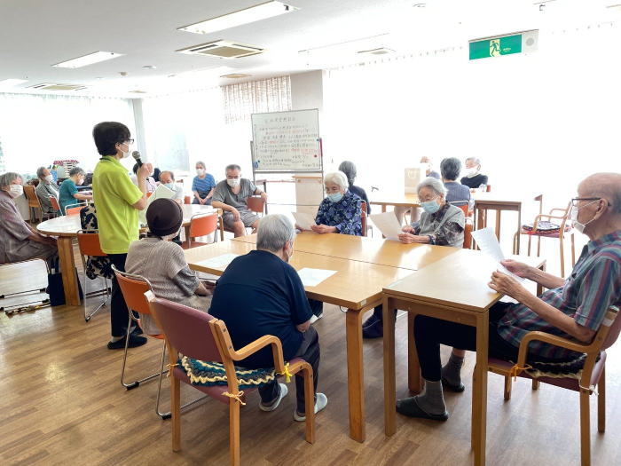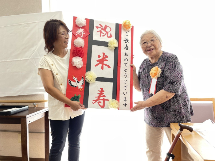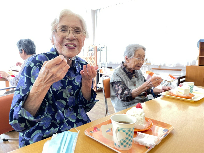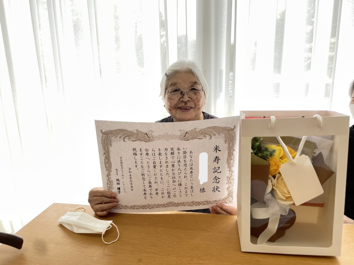 さぬき 2023.09.15 運営懇談会&米寿祝い 照れながらも、笑顔でパシャリ! 美味しそうにケーキを食べられていました。 本日は敬老の日が近いこともあり、米寿を迎えられた入居者様のお祝いをしました。施設長から記念状やお祝いの品をお渡しすると、お辞儀をしながら喜んで受け取ってくれました。 その後、ケアハウスの運営懇談会を行いました。今後の新型コロナワクチン接種やインフルエンザ予防接種等、健康管理についてお話させていただきました。