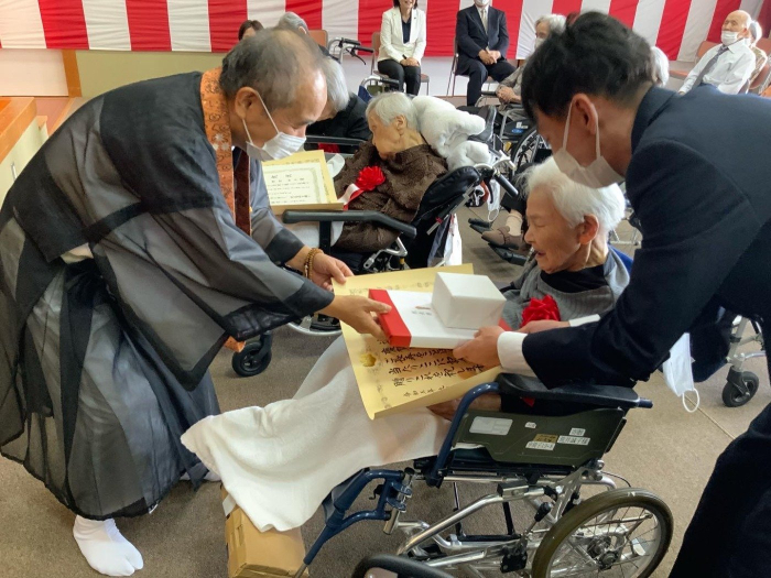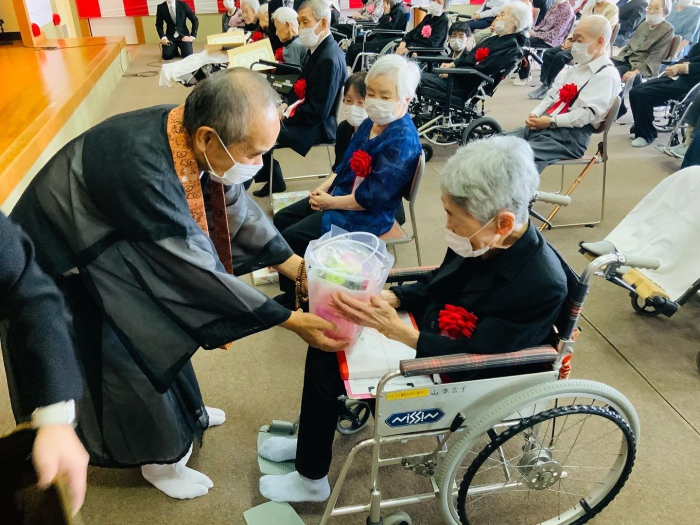 今年も100歳をこえるご長寿の方や祝い年の方にはお祝いの、そして職員のお手伝いをすすんで手伝ってくださっている方へは功労賞として賞状と記念品の贈呈をさせていただきました。