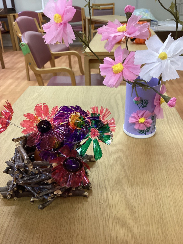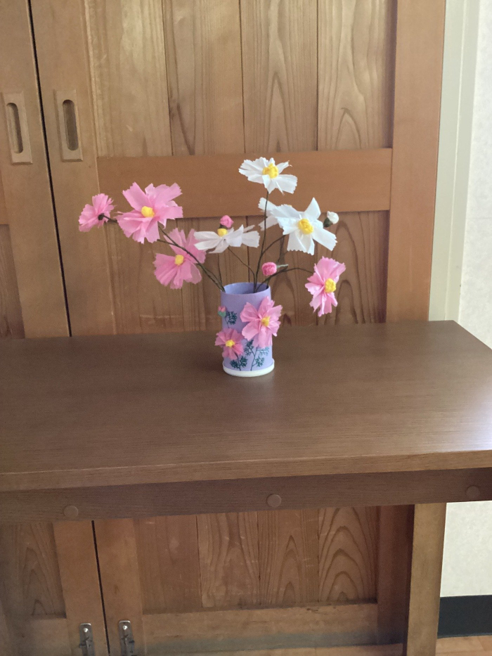 折り紙、画用紙、お花紙、卵パック等を使って作りました。