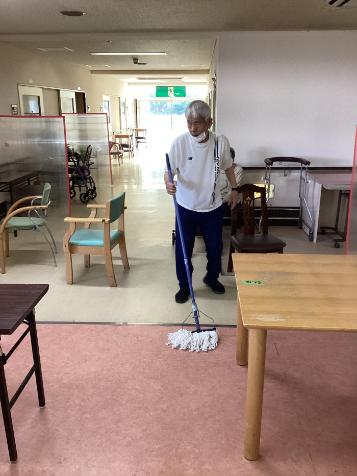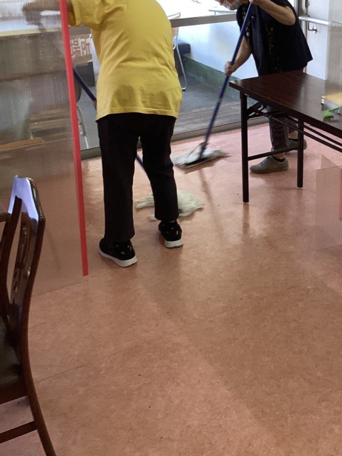 さぬき 2023.10.08 みんなで廊下の掃除 ご利用者から「3階の廊下の掃除がしたい」との希望があり、他2人のご利用者に協力をお願いすると快く引き受けてくださり、モップとヘラを使用して3階廊下の床をきれいにしました。 掃除して床が濡れていたら、他のご利用者が滑って怪我したらいけないと水拭きの後に丁寧に乾拭きまでおこないました。 自分たちが使ったところは自分たちで掃除をしてくれるのでとても助かっています。