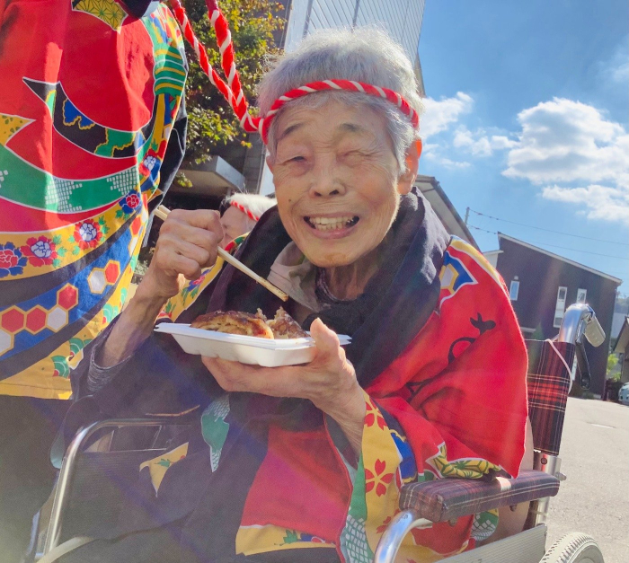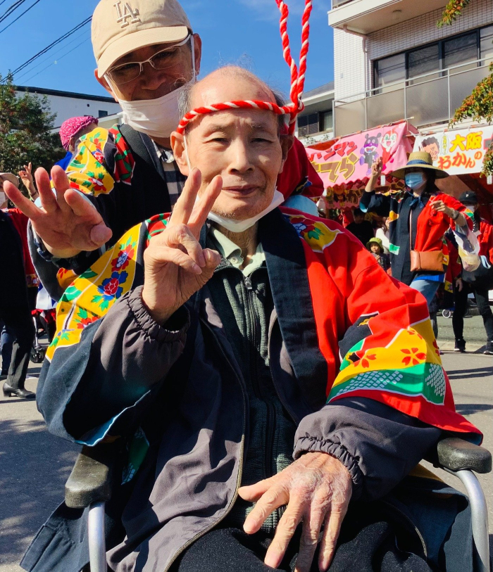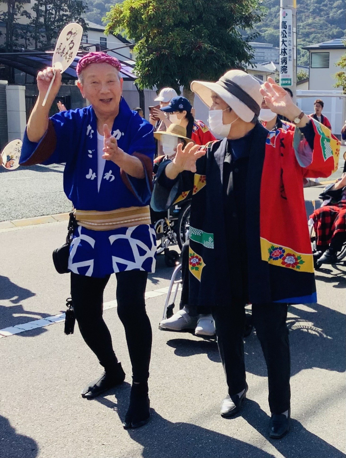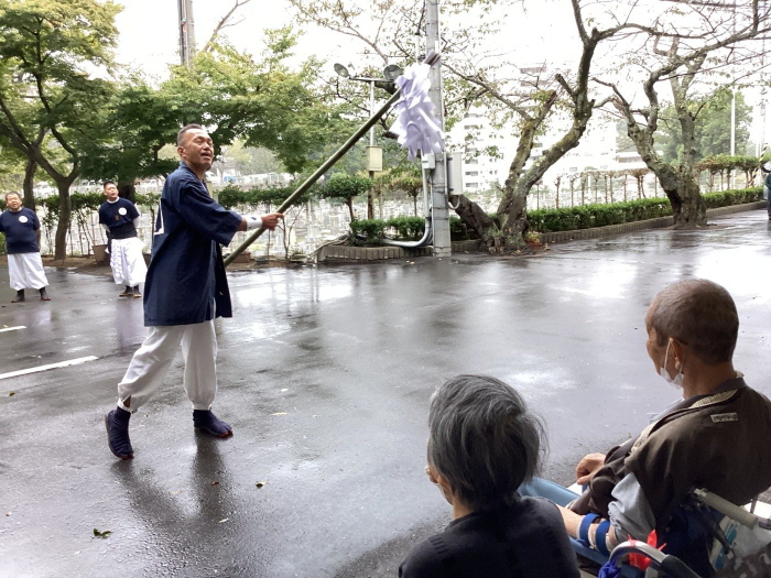 今年の慰問予定の日はあいにくのお天気でしたがさぬきの玄関前まで来てくださっており、よく通る大きな声で掛け声をかけながら皆さんの健康とご長寿を祈ってくださり「お祭りでも会いましょう!」と言ってくださっていました。