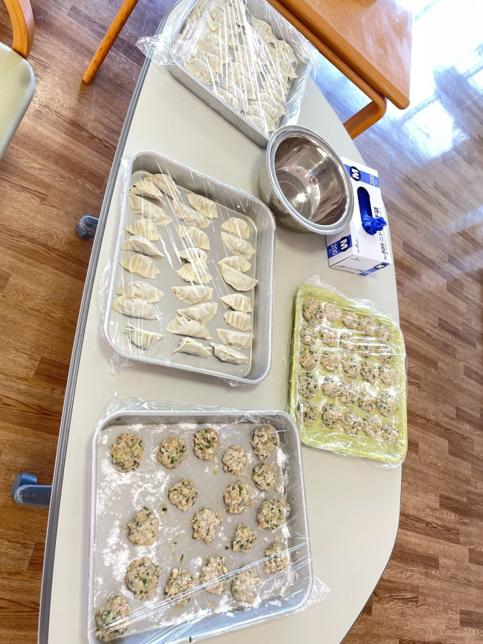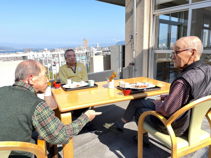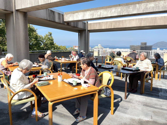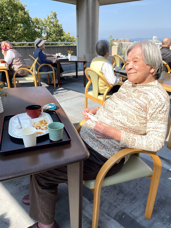 さぬき 2023.11.01 秋晴れの下で 天気が良く、過ごしやすい気候ということもあり、5階屋上で野外食風ランチを行いました。 午前中に、お料理が得意な入居者様数名とギョウザの皮を包みました。「餡はもう少し減らした方がいいよ。」「ひだは多い方が綺麗よ。」とアドバイスしていただき、みんなで協力しながら、なんとか作り終える事ができました。 昼食時にホットプレートを使い、ギョウザやお肉をその場で焼いて提供すると、みなさん美味しそうにペロリと完食されていました。
