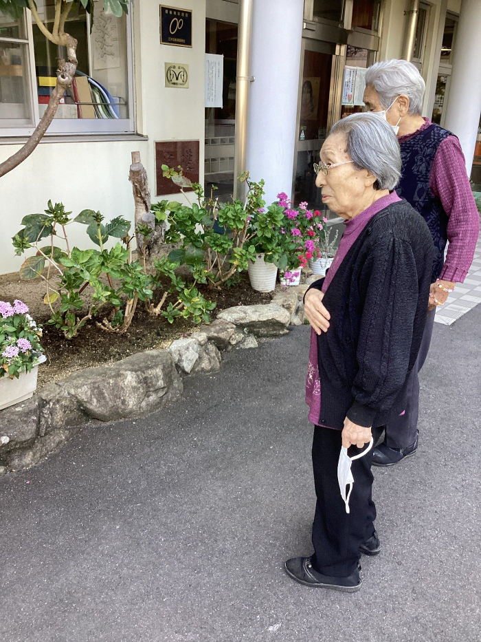 さぬき 2023.11.14 秋の風を感じながら園内散歩 散歩がしたいとご利用者からの要望があった為園内散歩を実施しました。 「あらー今日は雲一つないいい天気やね」とおっしゃり、太陽の日差しと涼しい風の心地よさに自然と笑顔になっていました。 花壇に植えてある花を見たり草木に触れたり、少しずつ木々も紅葉してきてるので秋を感じながら時間を過ごす事ができました。