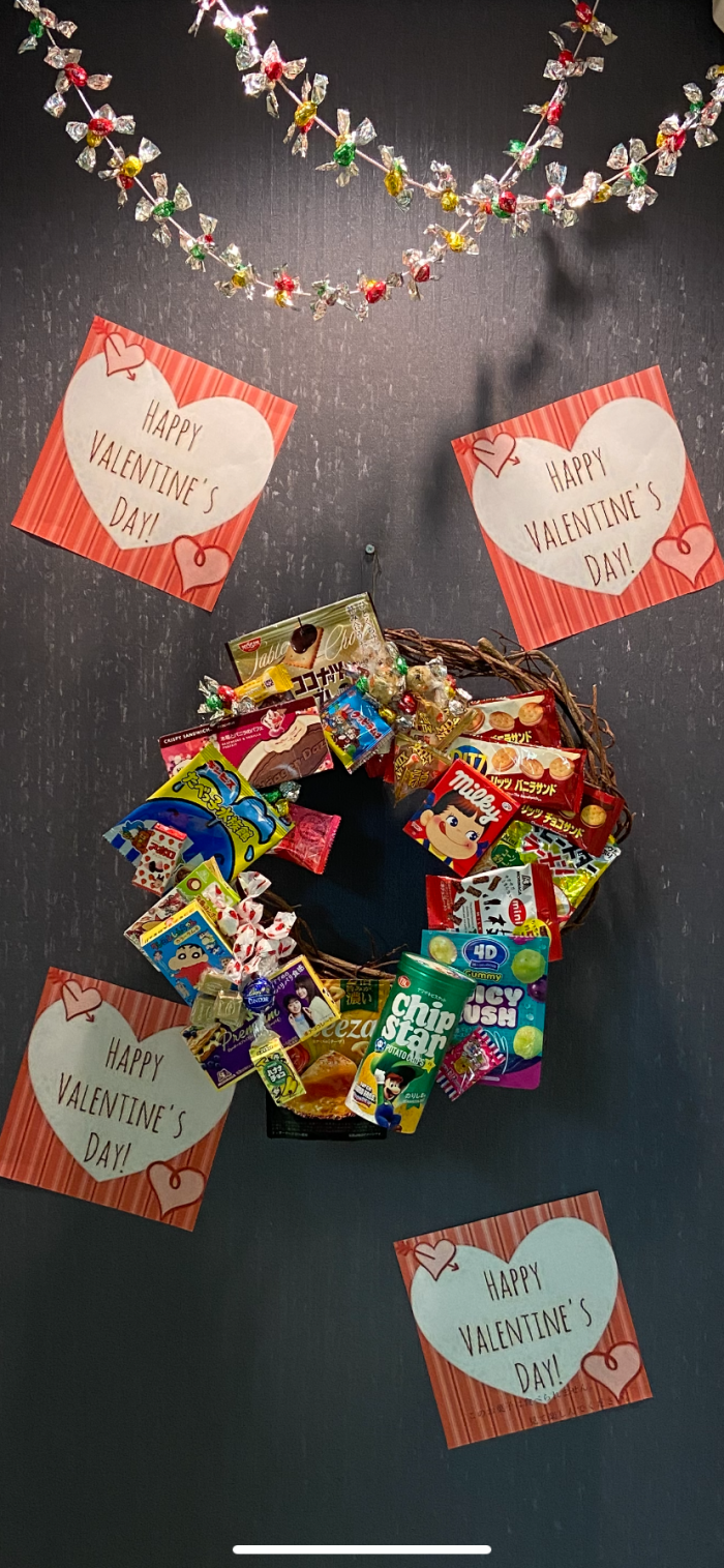 さぬき 2024.02.09 Happy Valentine!! 沢山のお菓子の袋を集め、お菓子のリース作成。 お菓子のいい匂いにかこまれました。 作ったリースは支援センター前の棚に飾りました Valentineの雰囲気バッチリです