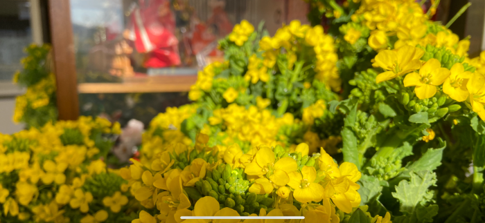 さぬき 2024.02.09 おひなさま 今年もデイルームにひな人形がお目見えしました ご利用者様よりご寄贈いただいた娘様のひな飾りです 今年は、池田町の菜花農園廣田さんより沢山の菜の花を頂き、一緒に飾らせてもらいました。ありがとうございました。 菜の花の香りにかこまれ、まったりほっこり