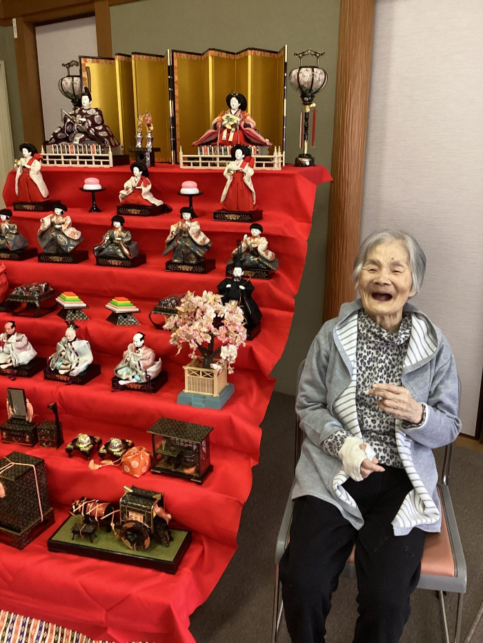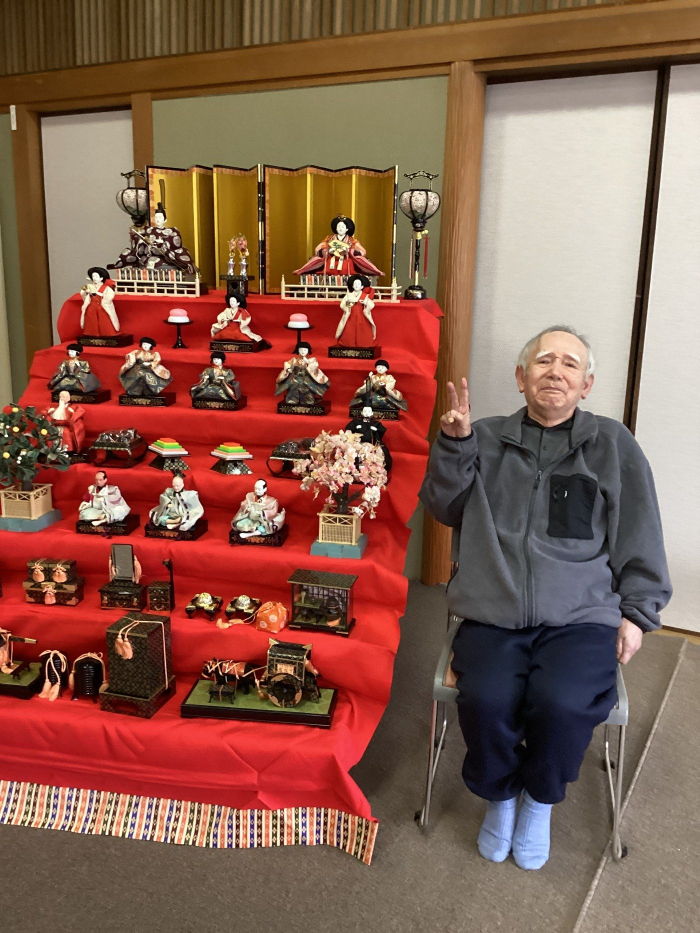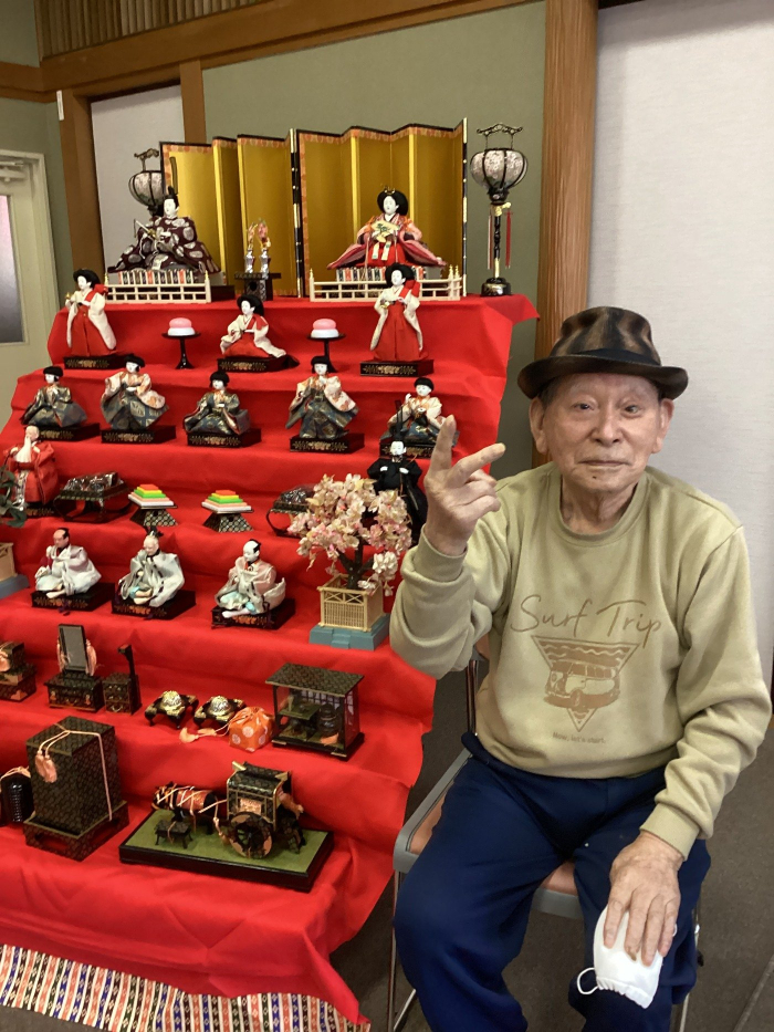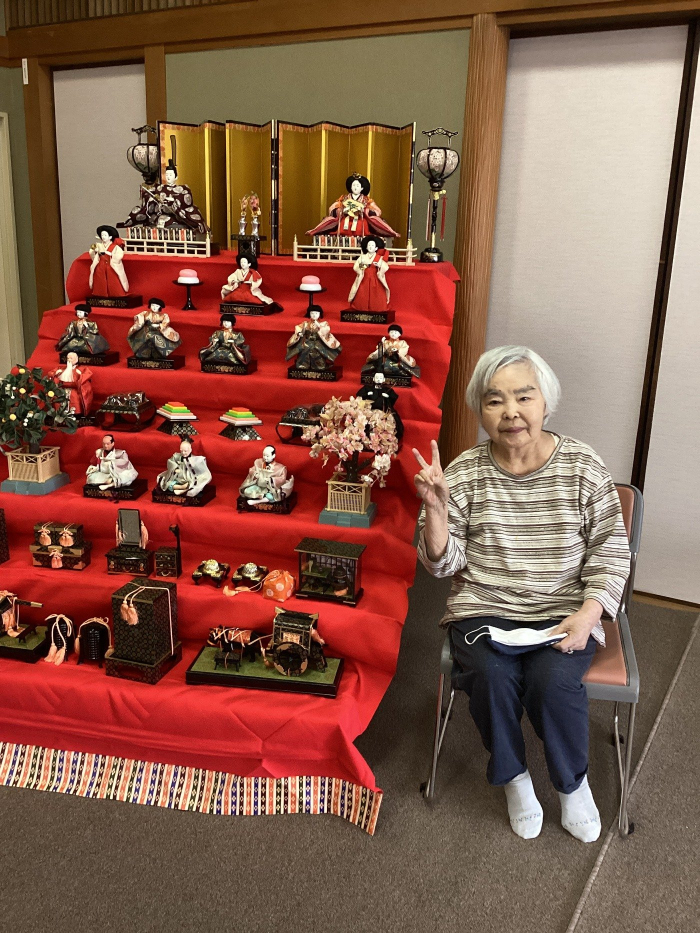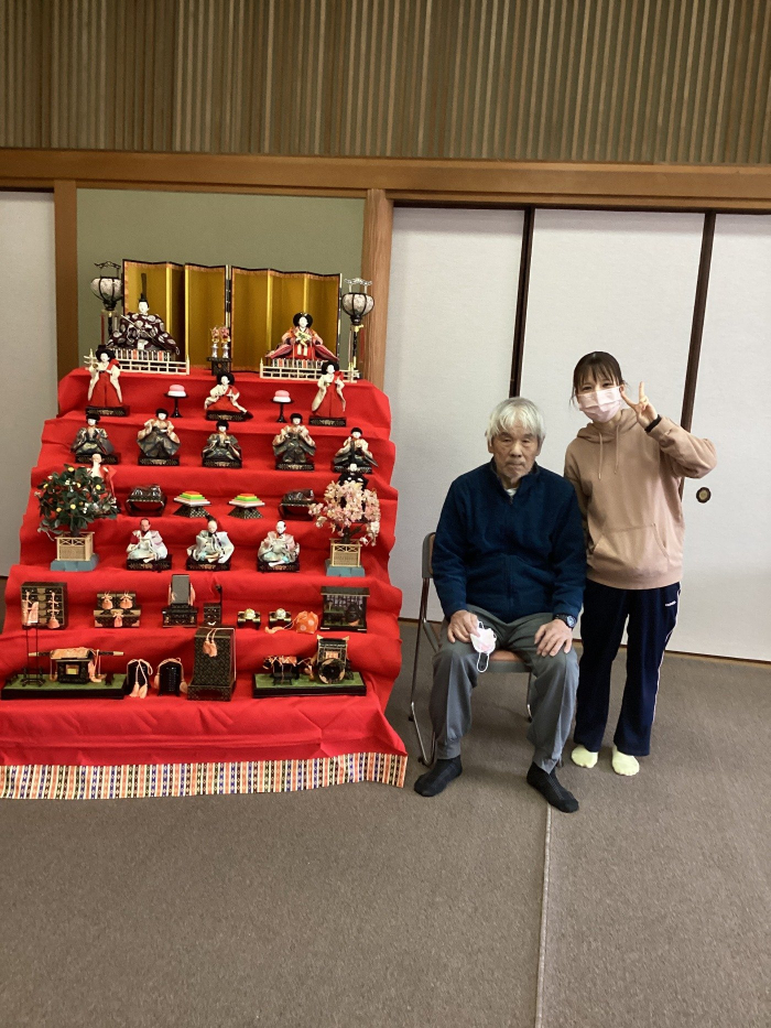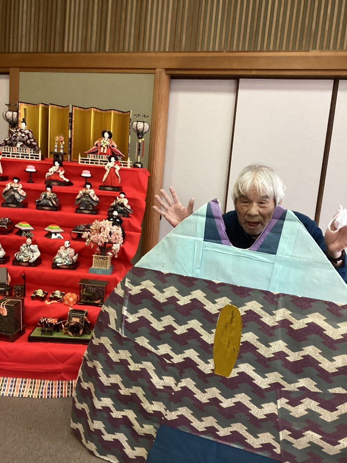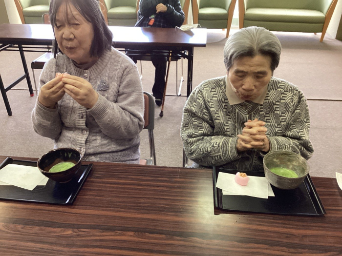 さぬき 2024.03.05 【養護】ひな人形を眺めながらお茶会 3月3日にひな祭りのお茶会をおこないました。 養護では毎年立派なひな人形が飾らるため、お饅頭を召し上がる前にひな人形と写真撮影。 みなさんひな人形を見ては「すごい立派やなー」と拝んだりする方もいました。 写真撮影中などは職員と一緒に撮影する人などもおり、とても笑いの絶えないお茶会になりました。 お茶の点て方が良いと、おかわりの要望がありとても好評でした。