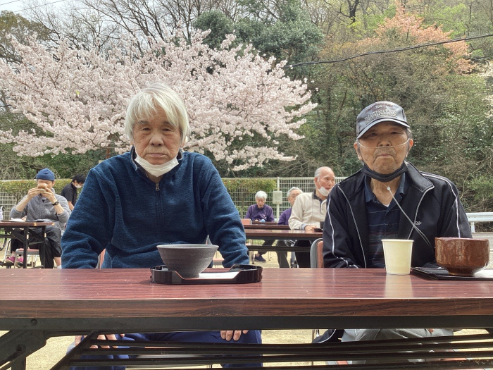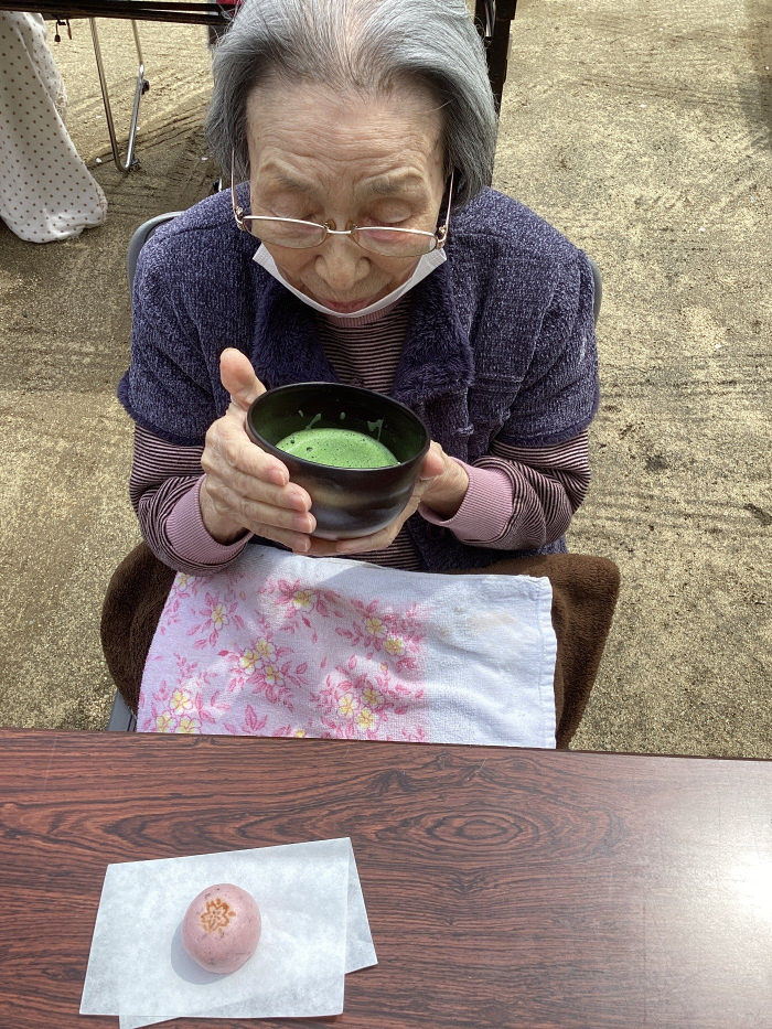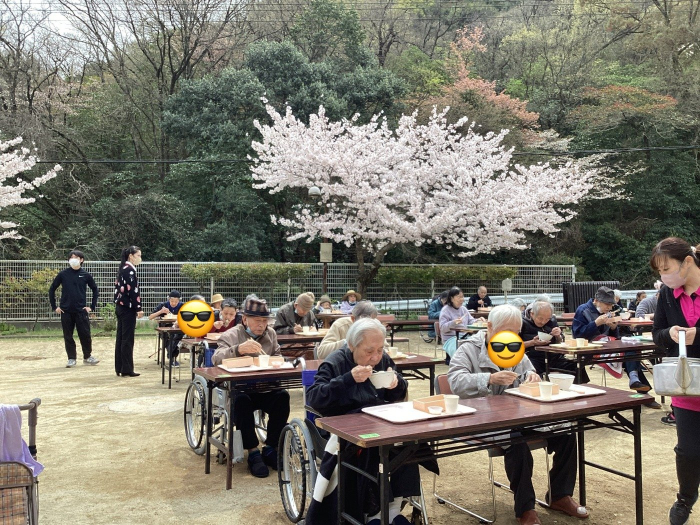 さぬき 2024.04.05 【養護】お花見 満開の桜の下、花見会を開催する事ができました。 お弁当のフタを開けると「うあーっ!」と歓喜の声があがるほど。 しばし花見を忘れ、一心不乱に箸をすすめる姿が見られていました。 花見茶会も開催し、お抹茶とお菓子もいただきました。 その後は、時間の許す限り青空の下でカラオケ! 「ヤッホゥ!いいよ!」のかけ声、手拍子で大盛り上がりでした。