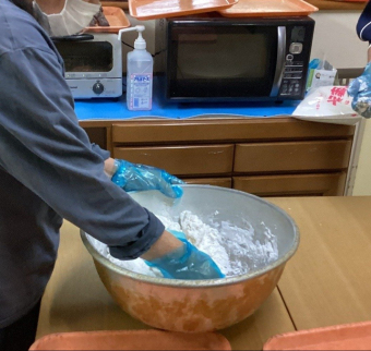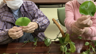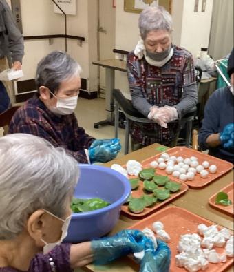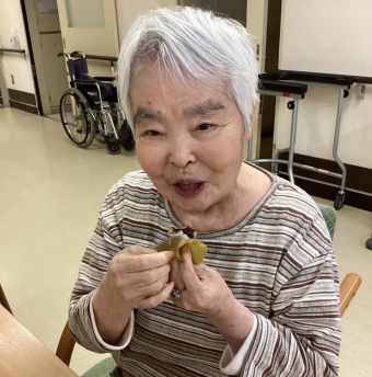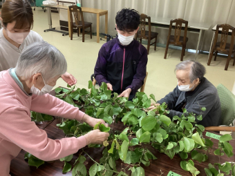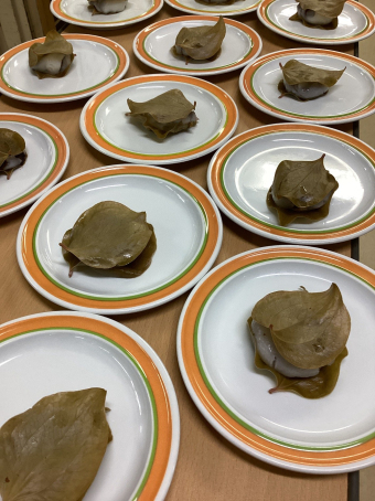 さぬき 2024.05.02 【養護】かしわ餅 (o^―^o) 手作りかしわ餅!! サルトリイバラの葉で包んで、蒸しました。 チクチクと、トゲのあるサルトリイバラのつるから葉をもぎ取りました。 餡を丸めて、練った生地に包み、蒸し器へ! 10~15分程でいい匂いが漂い、ホカホカのかしわ餅ができあがりました。