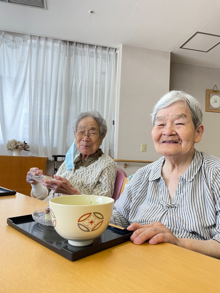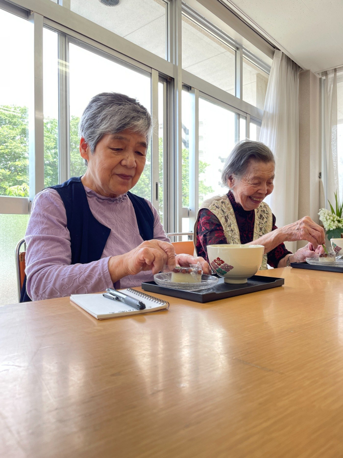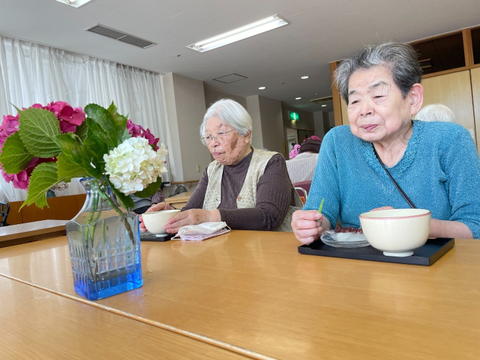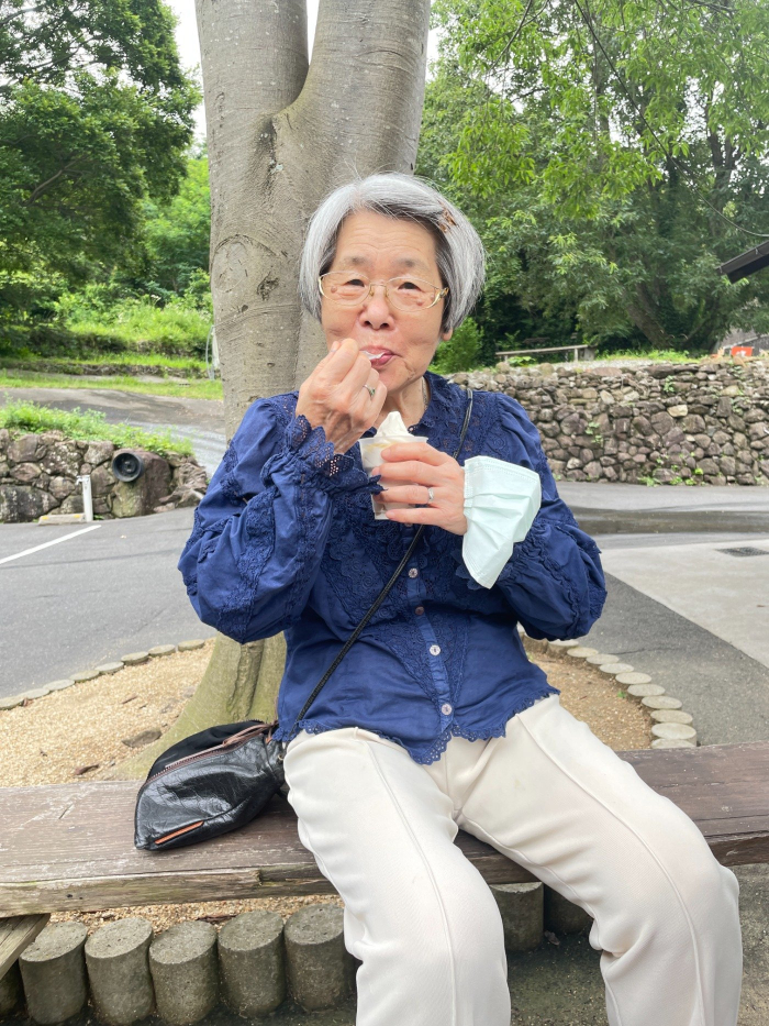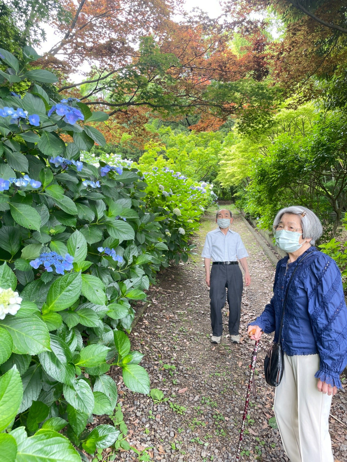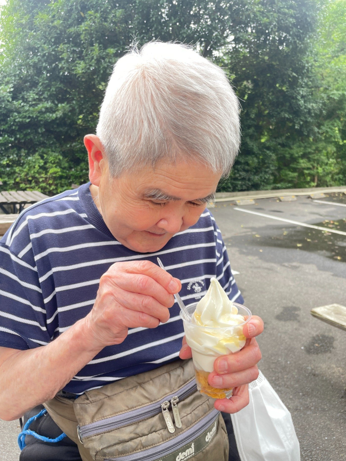 また、6月24日には峰山へお出かけしてきました。峰山はちみつさんでお土産を購入したり、はちみつソフトクリームを食べられました。この日は気温が高かったこともあり、「冷たくて美味しい!」と喜ばれていました。その後、峰山公園前の紫陽花をお散歩しながらゆったりと鑑賞しました。
