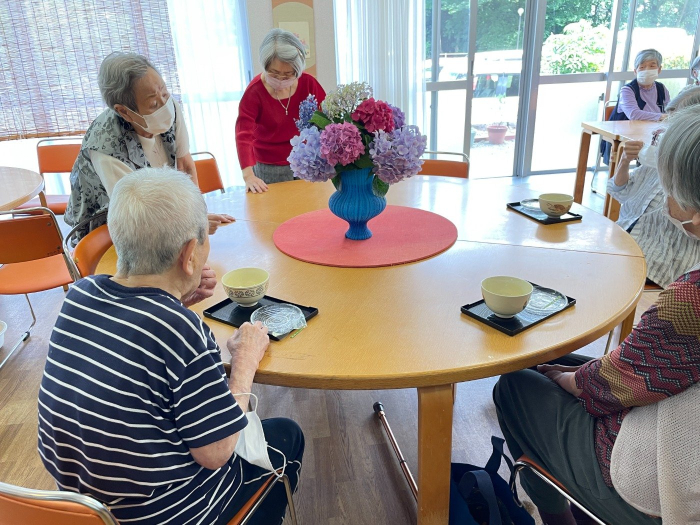 敷地内に沢山の紫陽花が咲いており、各テーブルに飾らせてもらいました。青、紫、白色等、色とりどりの紫陽花を観ながらお抹茶を楽しまれていました。
