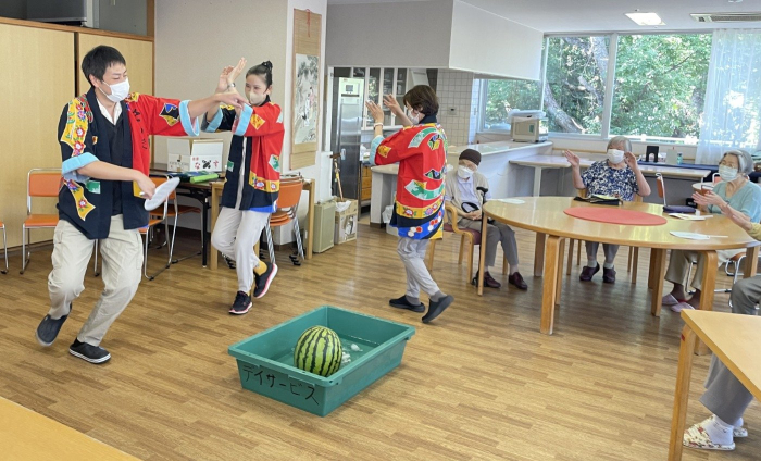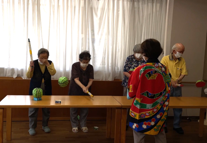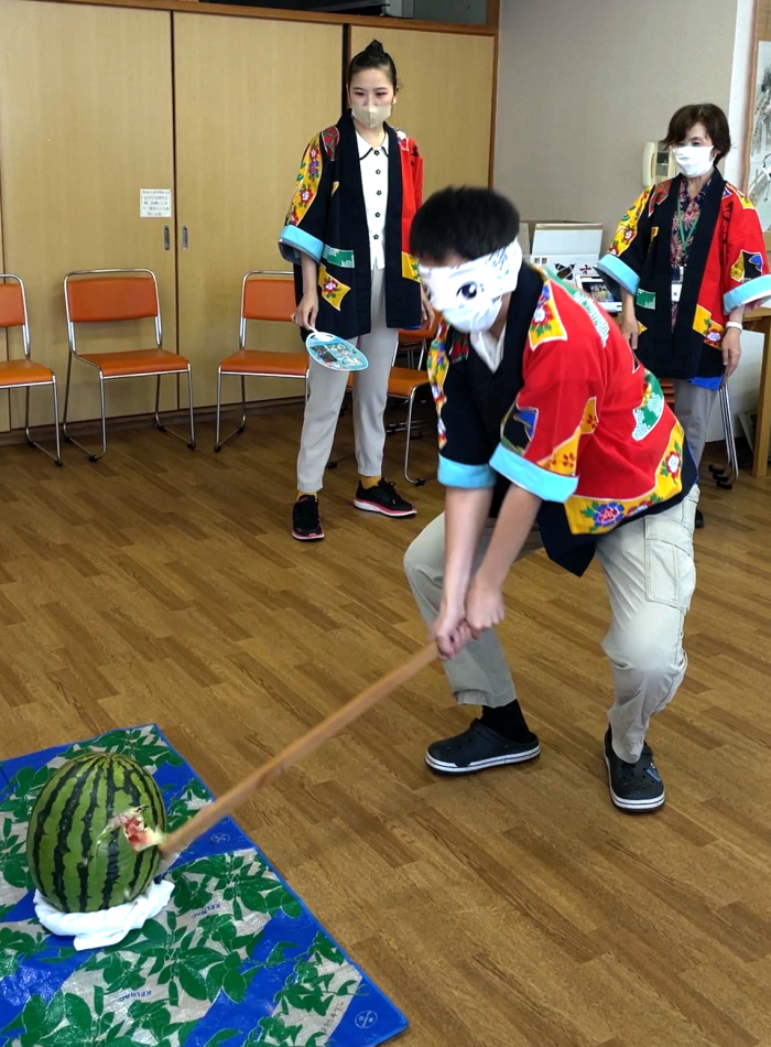 夏と言えばスイカ!という事で、ケアハウスではスイカ割りを行いました。