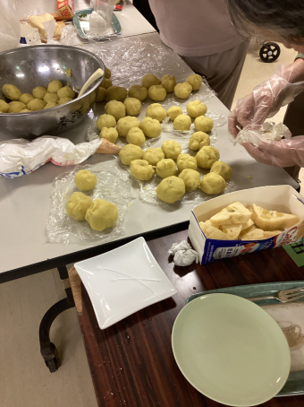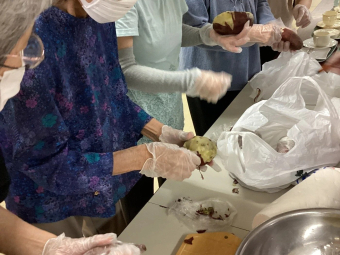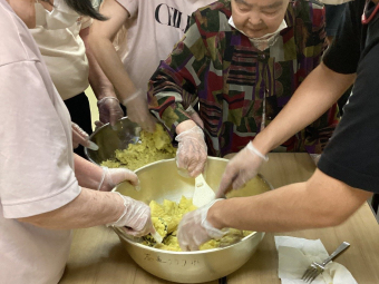 芋を潰すにも力が必要で、男性の入居者様が、「俺がするでー!」と困っていた女性の入居者様に変わって熱心にこねてくれました(^^♪