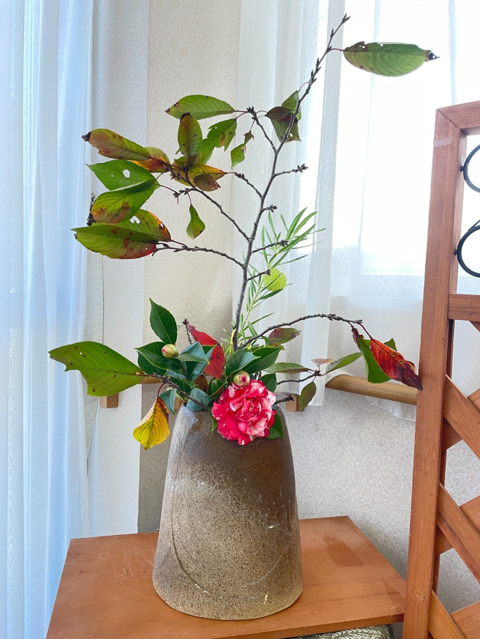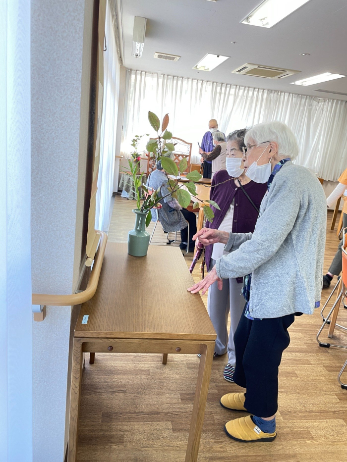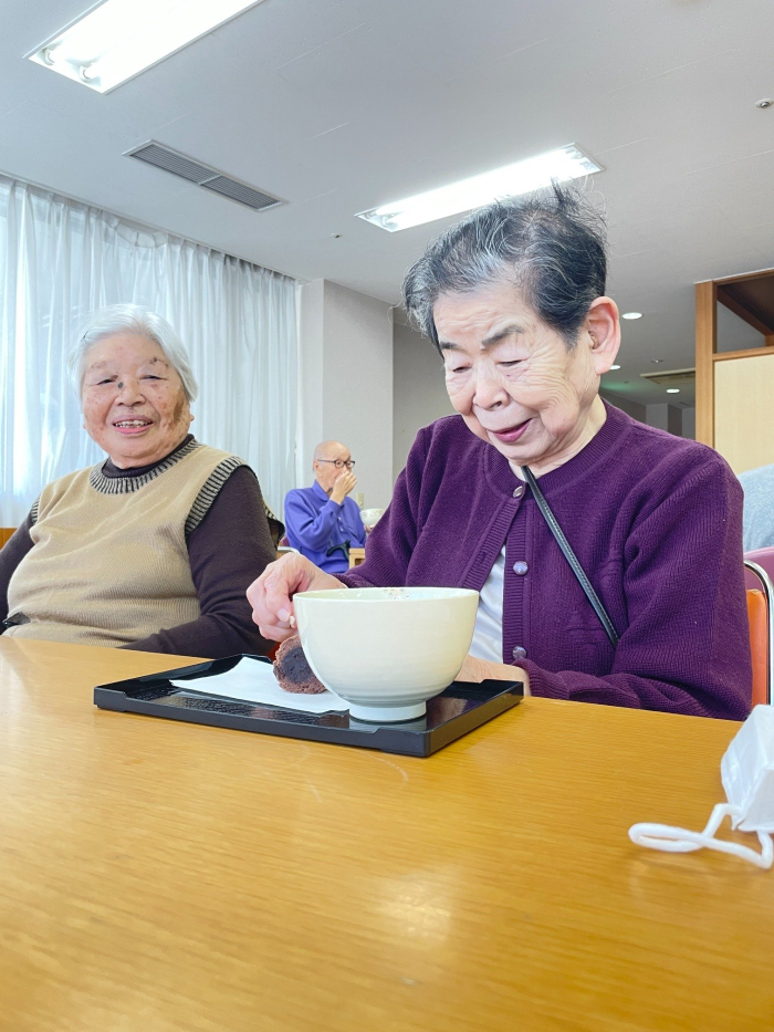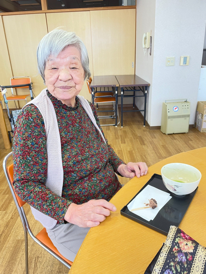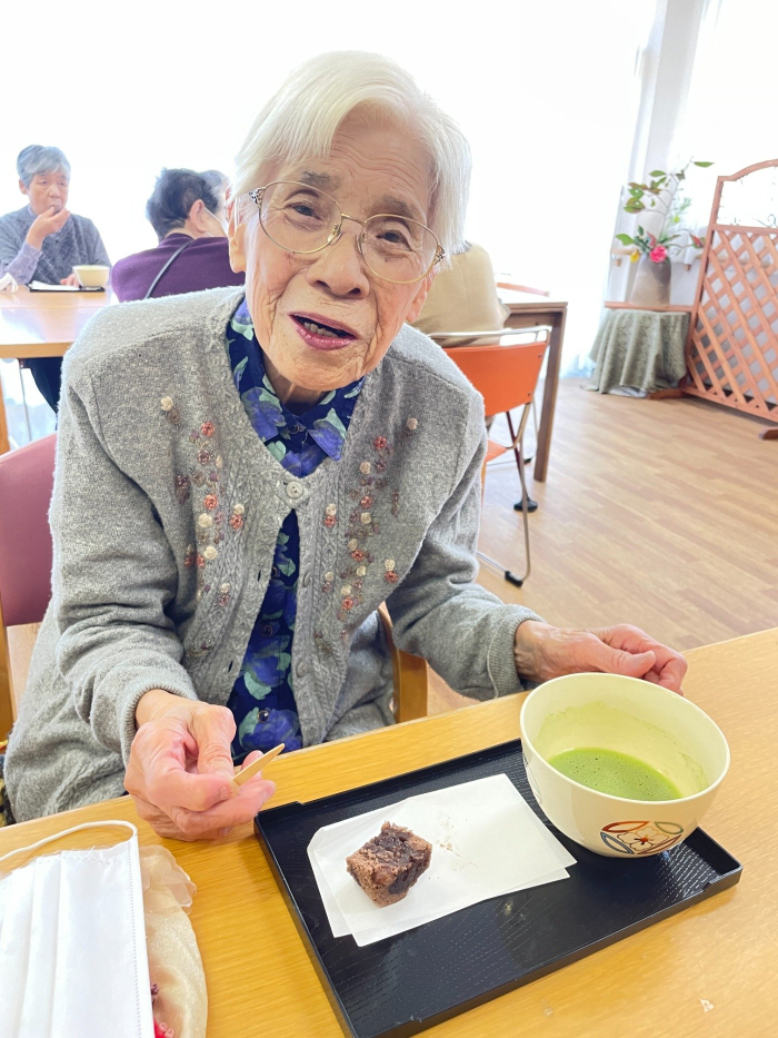 さぬき 2024.11.25 晩秋のお茶会 「このお菓子、美味しいわねぇ。」と喜ばれていました。 飾らせてもらった桜の木と鮮やかな椿の花を、暫く鑑賞されていました。 だんだんと寒くなってきましたが、お障りなくお過ごしでしょうか。 ケアハウスでは施設周りの桜の葉が紅葉になり、皇帝ダリアも咲いたとあって秋らしさを感じております。 先日お茶会を行い、今回は三友堂さんの季節限定の「鹿」という和菓子を準備しました。参加してくれた入居者様に商品名を伝えると「へ~」と物珍しそうに見られていましたが、召し上がられると美味しいと喜ばれていました。