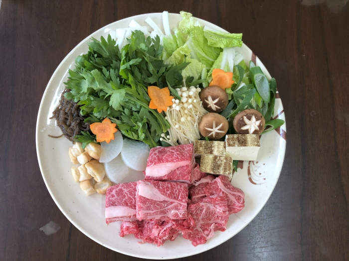 さぬき 2024.12.13 12月の地産地消 【献 立】 ・すき焼き(うどん) ・飲物 毎月第二金曜日は地産地消の日です。今年も鍋の季節がまいりました。第一回目はすき焼きです。 牛肩ロース(香川県産)、春菊(香南町)、大根(坂出市)、太ねぎ(綾川町)、椎茸(塩江町)、うどん(香川県産小麦粉使用)と、たくさんの地場の食材を皆様に召し上がって頂きました。 皆様、口々に「美味しい!美味しい!」とおっしゃり、おかわりをたくさんして下さいました。